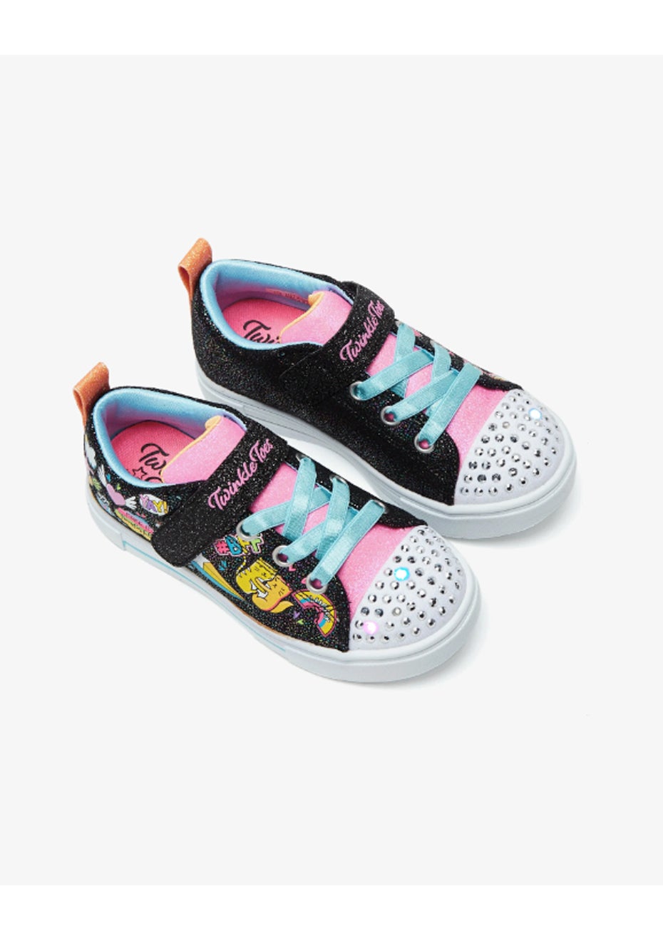 Pair up with your best buds in magical style wearing Skechers Twinkle Toes®: Twinkle Sparks - BFF Magic. This glittery light-up slip-on features a 'Make It Wonderful' print canvas upper and a hook and loop strap closure with a rhinestone embellished toe. WARNING: This product contains non-replaceable coin batteries. Coin batteries are hazardous and can cause severe or fatal injuries in as little as two hours if swallowed or placed inside any part of the body. Do not attempt to access the battery. Keep batteries away from children whether new or used. If you think that batteries might have been swallowed or placed inside any part of the body, seek immediate medical attention. You should also contact the Australian Poisons Centre (available 24/7) on 13 11 26 for fast, expert advice.