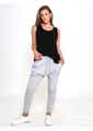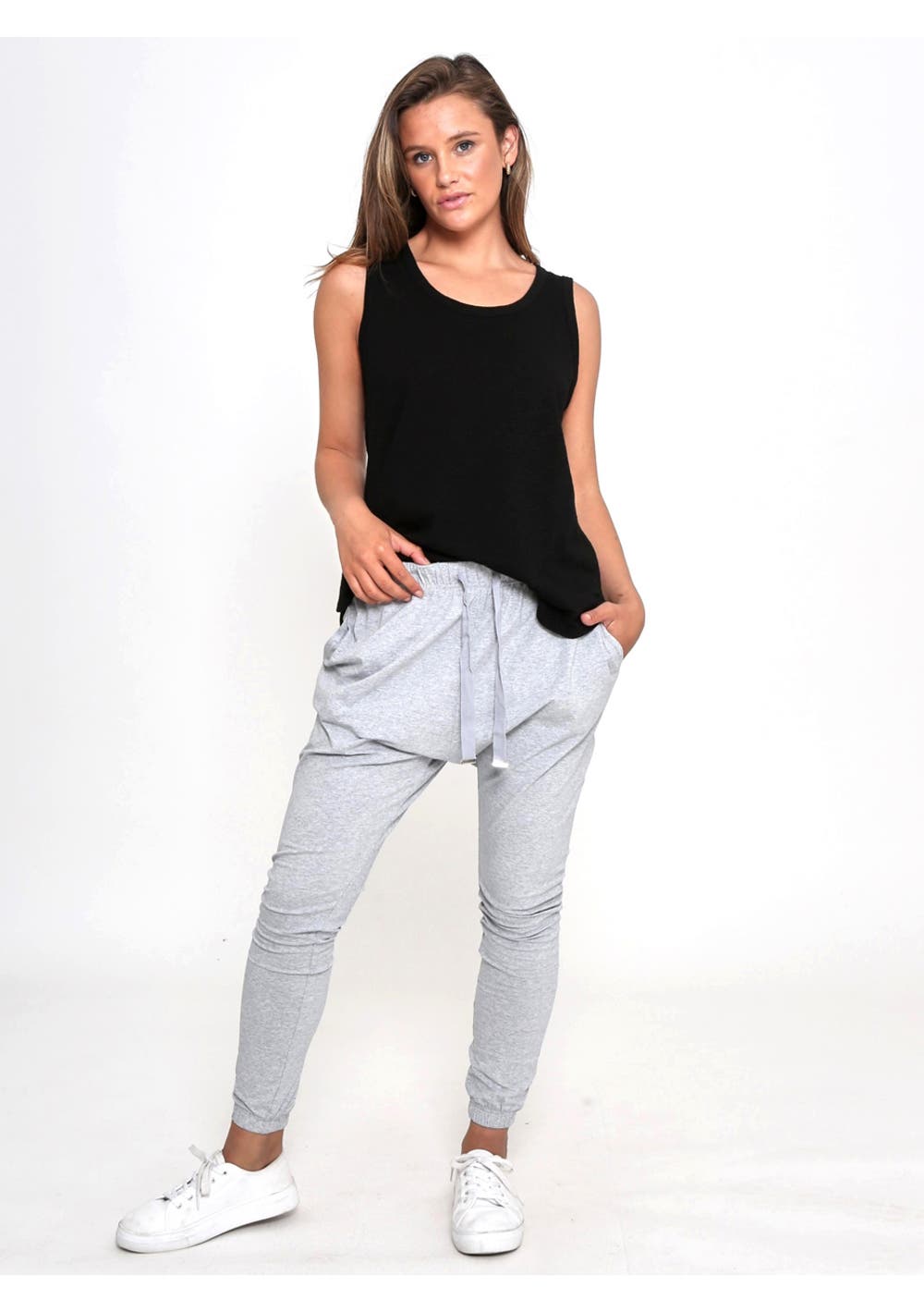 Elastic waist Drop crotch Fitted leg Pockets Tie waistband