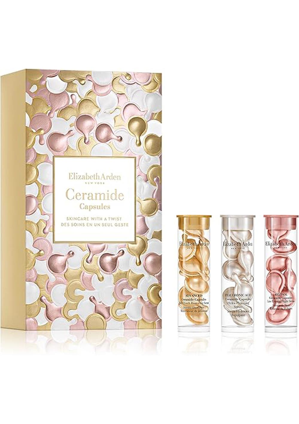 The Skincare With a Twist Set is a perfect way to experience several of our most popular capsule serum formulas — and a great gift. From Elizabeth Arden, the creator of several iconic and bestselling skincare collections, the presentation includes targeted treatments to nourish and firm skin, as well as smooth fine lines and deliver vital, plumping hydration. Includes: Advanced Ceramide Capsules Daily Youth Restoring Serum 7 pieces, proven to help replenish ceramides, the building blocks of healthy, firmer-looking skin. Hyaluronic Acid Ceramide Capsule Hydra-Plumping Serum 7 pieces, which harnesses one of nature's most powerful humectants to deliver hydration to moisture-starved skin. Retinol Ceramide Capsules Line Erasing Night Serum 7 pieces, which is shown to visibly diminish lines and wrinkles while improving skin’s texture and tone.