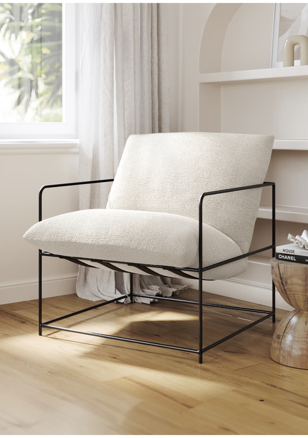 Soft touch boucle fabric upholsters the plump cushions for maximum comfort. The stainless steel frame adds an understated yet luxe finishing touch.