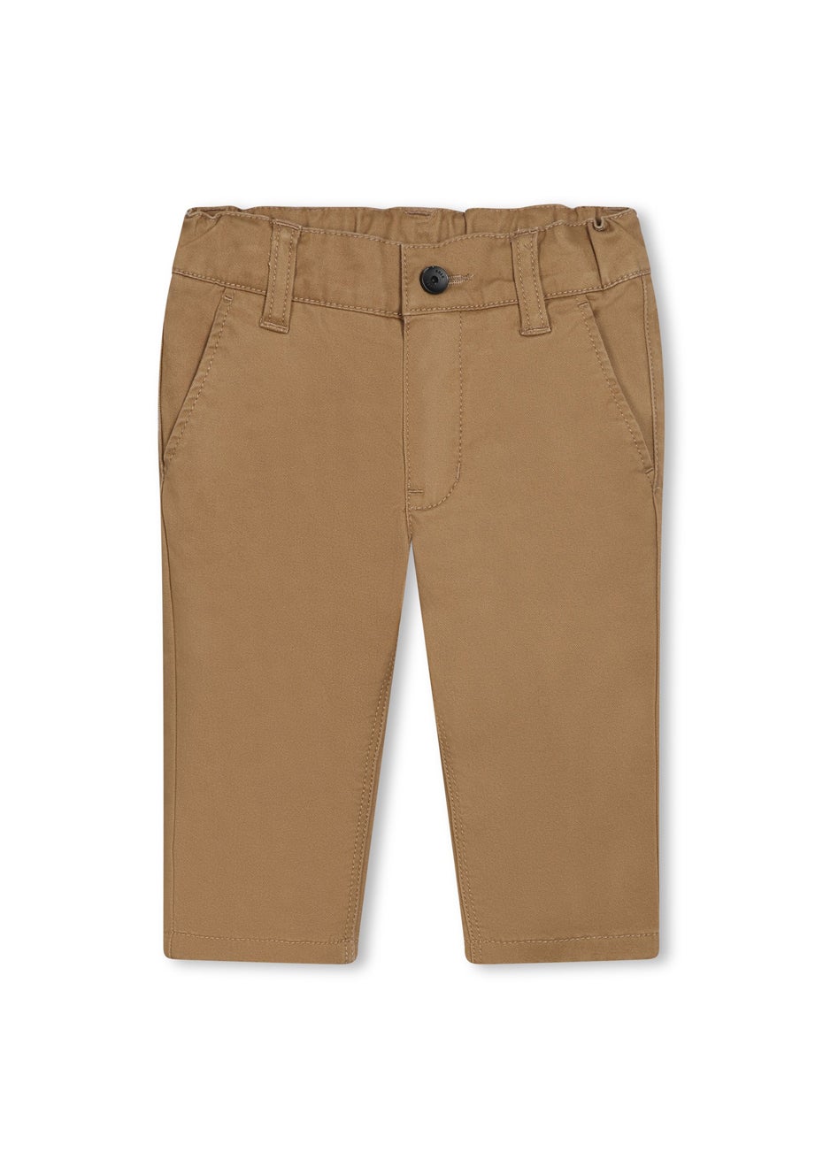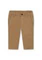 Brown cotton twill pants by Boss for babies with belt loops, front zip and hook fastening, adjustable waist with internal elastic with button, side pockets and back pockets. They are decorated with a striped detail on the back. Color: brown Composition: 97% cotone 3% elastan