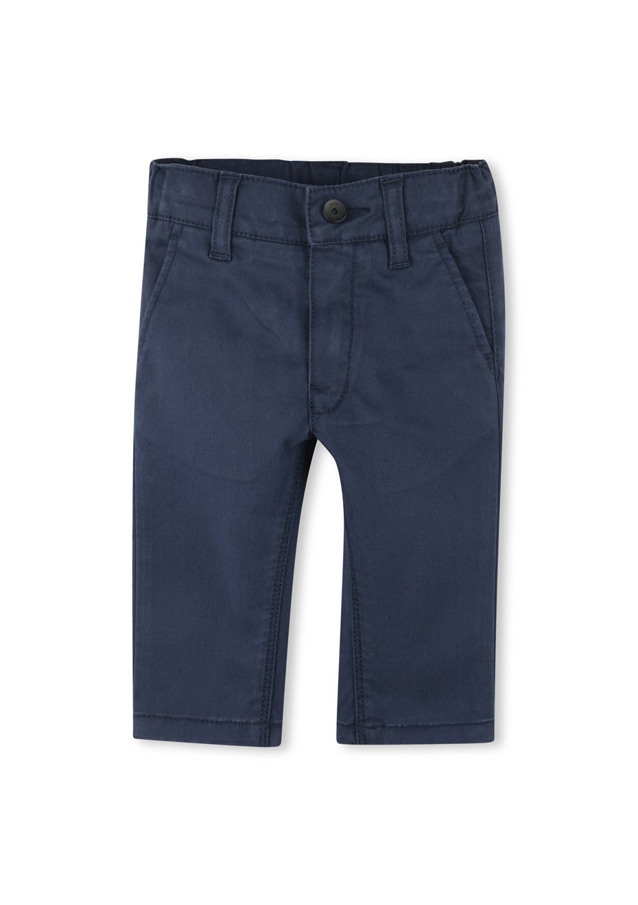 Cotton/elastane twill pants, adjustable waist up to 3 years, 2 side pockets and 2 back, striped label on the back pocket.