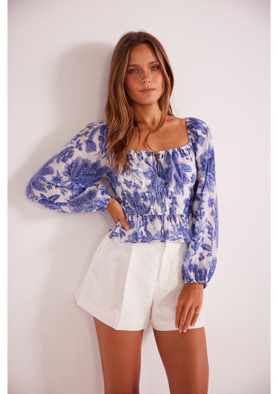 The blue and white floral blouse features a deep V neckline with a square neckline with a tie detailing and a shirred fitted waist with a peplum