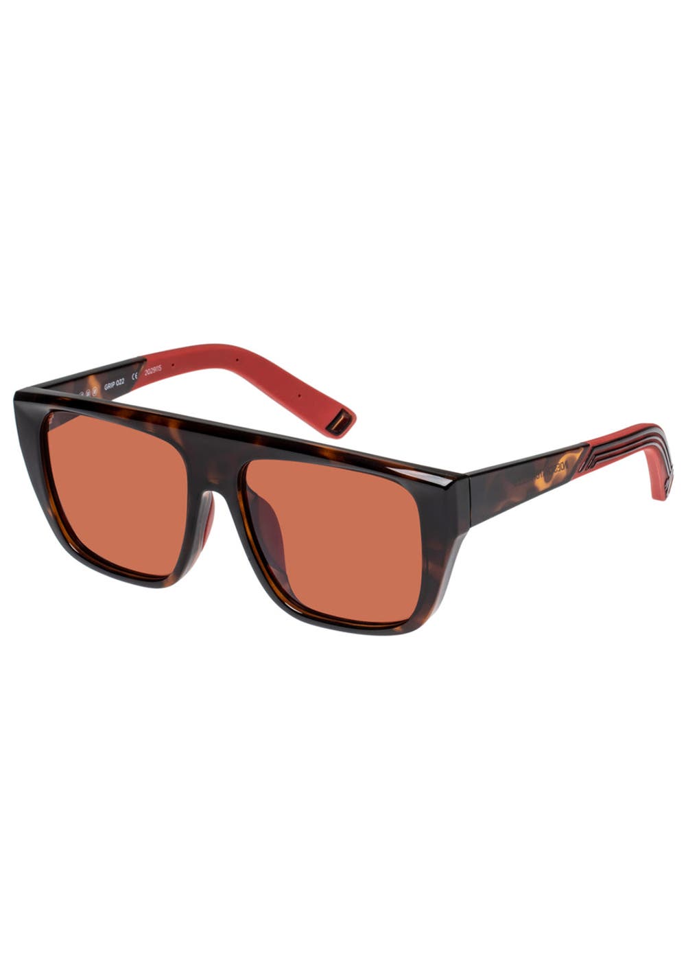 Part of the GRIP series, made by injecting rubber and TR90 material into custom mouldings for a detailed, functional frame * Hydrophobic, water-repellant lens coating with increased hardness for better scratch resistance * Bevelled flat-top style with a wider fit * Inset rubber nose pads and inner temple zone for increased traction on face * Dark tortoise-shell frame with conrast red oxide rubber trim and redwood mono lens