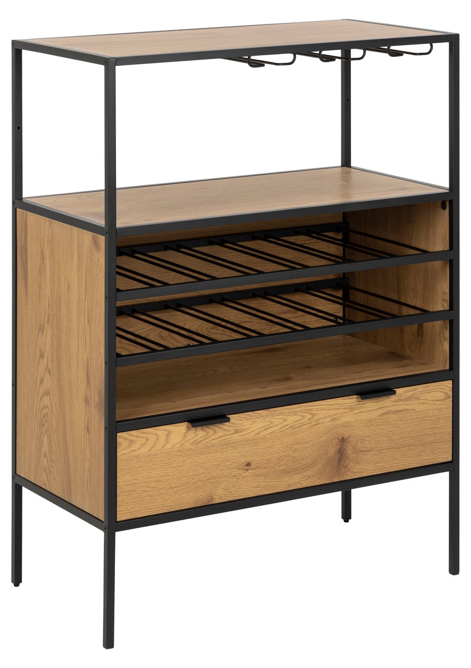 Let’s raise a glass to this multifunctional cabinet. With practical storage for both wine glasses and bottles, this will be a preferred choice for wine lovers. Place snacks on the top and hide utensils in the drawer – there is plenty of room. The combination of metal and wild oak look gives it a rustic, industrial feel that will enhance any modern home. Key features: - Modern cabinet in wild oak look - Frame in black rough powder coated metal - Features bottle rack and glass holder - Shelves and drawer for storage Product Dimensions: 77cm (W) x 40cm (D) x 105cm (H) Max weight capability main surface: 31.25kg