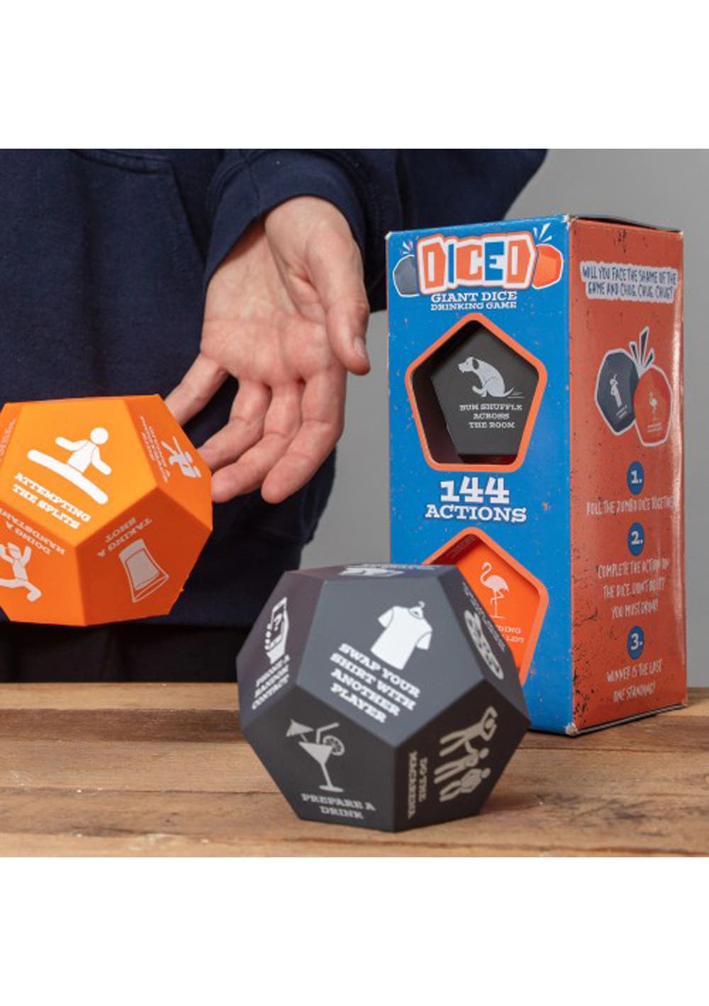Roll the dice and face the shame of the game with this fun Diced giant dice drinking game! Roll the dice, combine the actions (starting with the grey dice), and complete them - if you fail, you drink! Would you lick a big toe while pretending to be a gorilla? Or could you down a beer whilst attempting to do the splits? Whatever you land on, with 144 combinations, this is sure to keep the laughs (and the drinks) coming!
