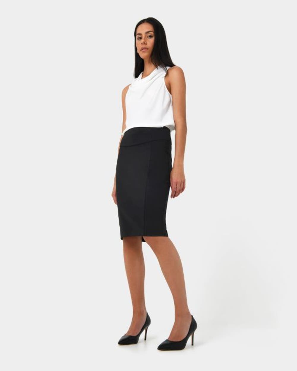 Free Shipping Over $100. The Safira Pencil Skirt is the staple suit skirt for your all year long corporate wardrobe. Designed to be form fitted in a classic pencil silhouette and cotton blend fabrication giving a slight stretch for a comfortable fit. Style with a white blouse and the matching Safira Suit Jacket for effortless suit dressing. ·Flattering pencil fitted silhouette ·Knee length ·High waist ·Invisible centre back zipper ·Back vent ·Waistband detail ·Tailored fit ·Front and back panel details ·Fully lined  ·Medium weight, slight stretch fabrication Model wears AU8/S and is 178cm tall, has an 78cm bust, 92cm hips and a 63cm waist Fit: True to size Length: 67cm