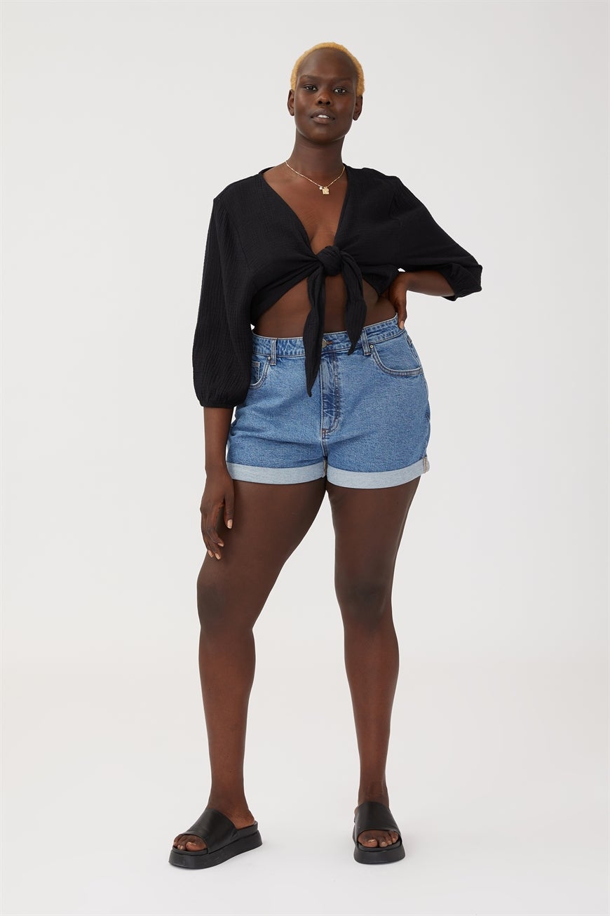Cotton On Curve Woven Tie Front Puff Sleeve Top Black