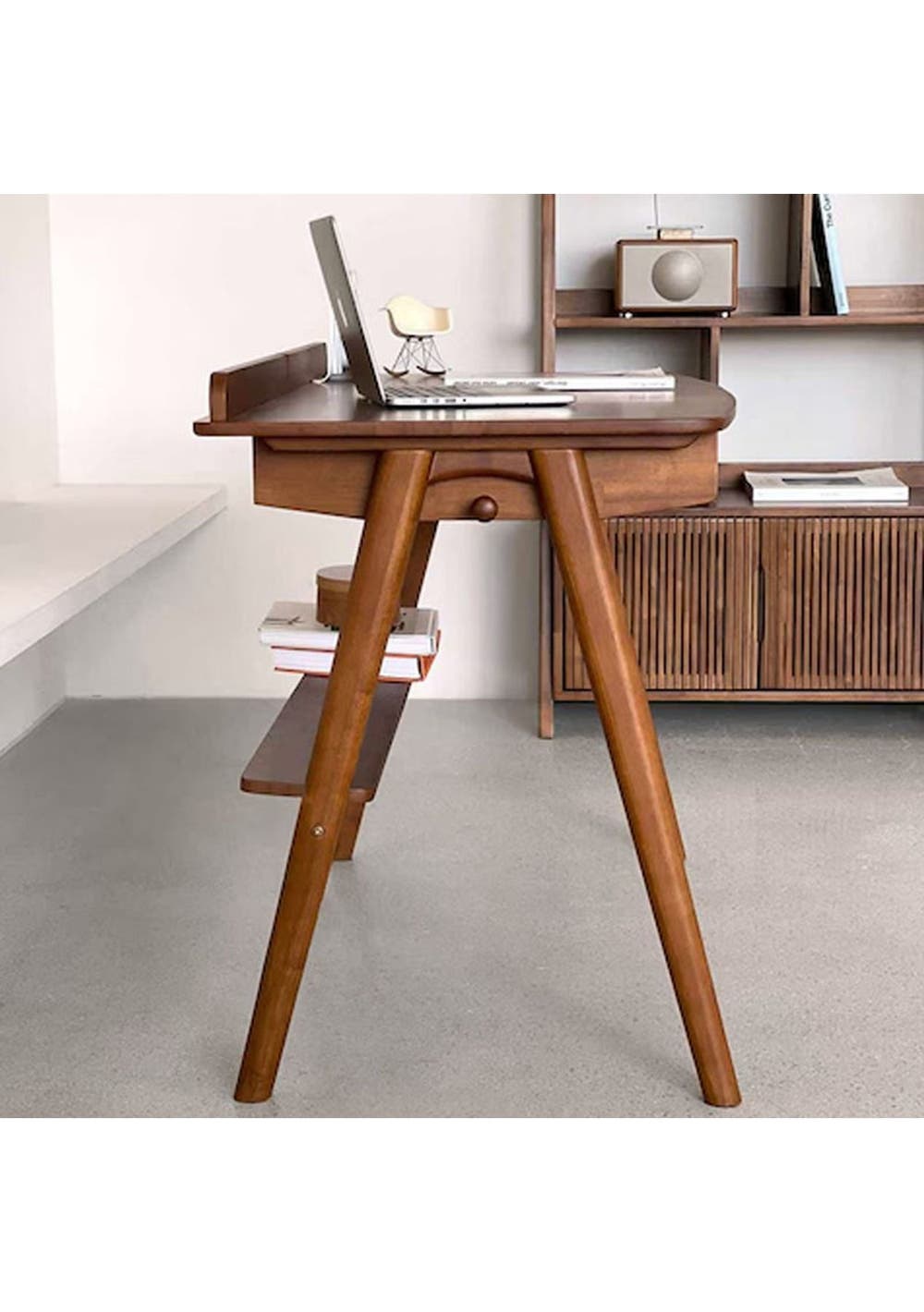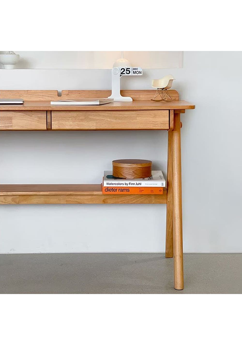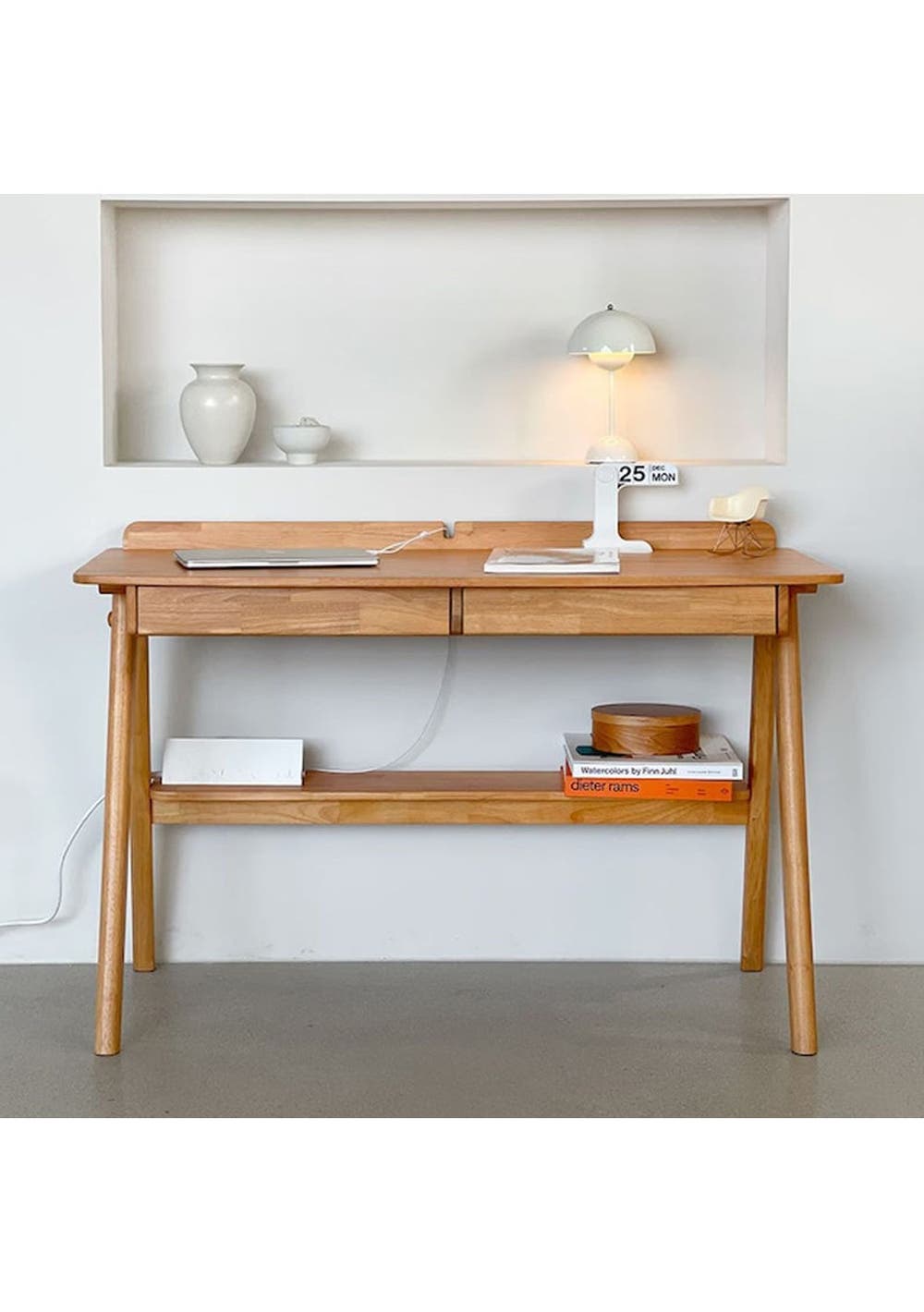 Minimal Wooden Desk with Practical Storage A natural wood desk that blends functionality with timeless charm. Its solid frame, thoughtful storage, and warm finish make it perfect for home offices, study rooms, or small spaces. Features ‚ Neatly store stationery and essentials in the two built-in drawers. ‚ Hooks under both sides of the desk provide a convenient spot for bags or headphones. ‚ Rounded corners offer a softer, safer touch for everyday use. ‚ Crafted from sturdy solid wood for long-lasting durability. ‚ Lower shelf adds extra storage for books and decor. Product details ‚ Dimension: W 1200 x D 600 x H 750 mm ‚ Materials: Rubberwood ‚ Assembly required: Yes (Simple legs assembly required) ‚ Available Colours: Natural, Walnut * Please note that the colour can be different from your monitor * Package includes 1 x Desk(Natural)