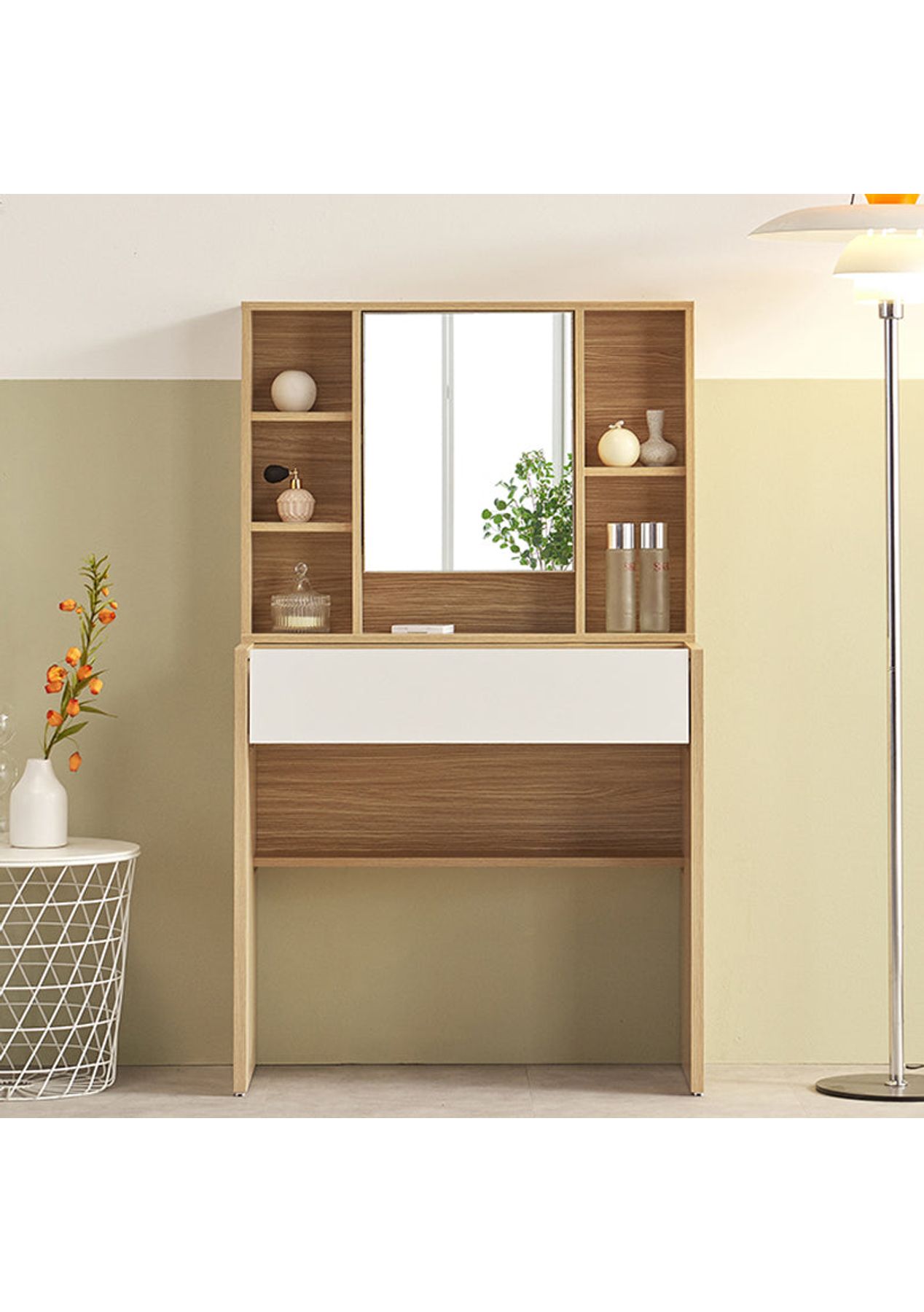 Compact Vanity with Hidden Storage With hidden compartments and a sliding glass top, it‚Äôs the perfect blend of function and warmth ‚Äî ideal for keeping your essentials organised without compromising on design. Product details ‚ Mirror-door opens to reveal hidden storage, including side and back compartments. ‚ Sliding glass top drawer makes it easy to view and access stored items at a glance. ‚ Crafted with 5mm tempered glass for added durability and safety. ‚ Clean, space-efficient design with practical storage for daily beauty essentials. ‚ Dimensions: W 820 x D 395 x H 1358 mm ‚ Materials: MDF, PB ‚ Assembly Required: Yes(Simple the top unit to the lower unit assembly required) ‚ Availabe Colours: White, Oak & White * Please note that the colour can be different from your monitor * Package includes 1 x Dressing Table(Oak)