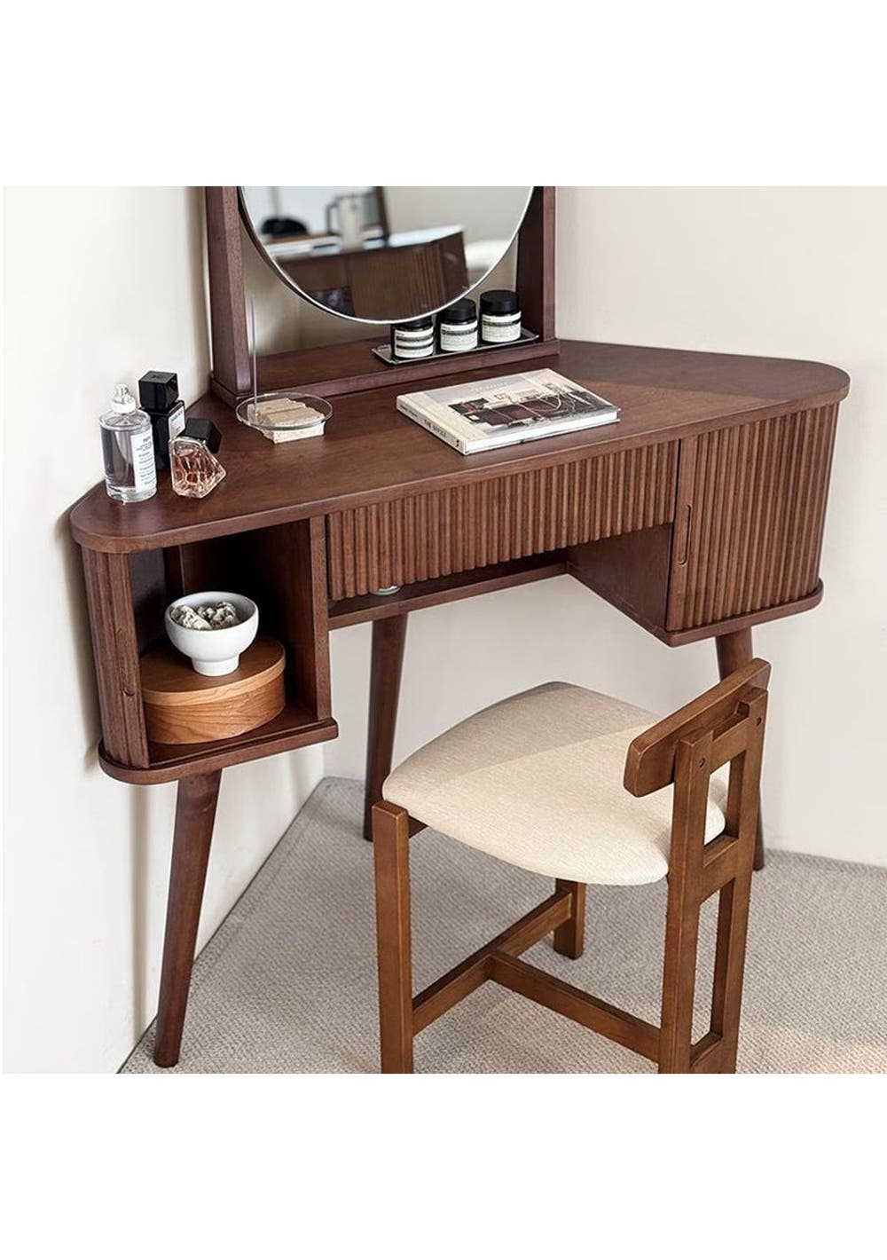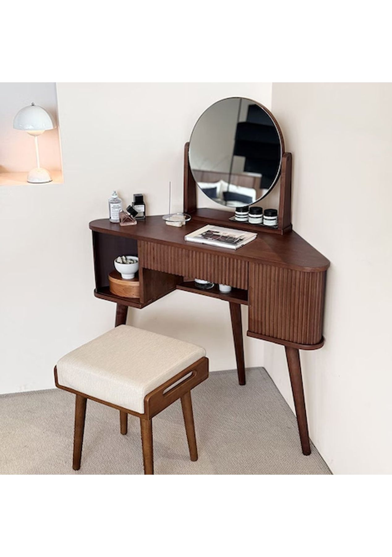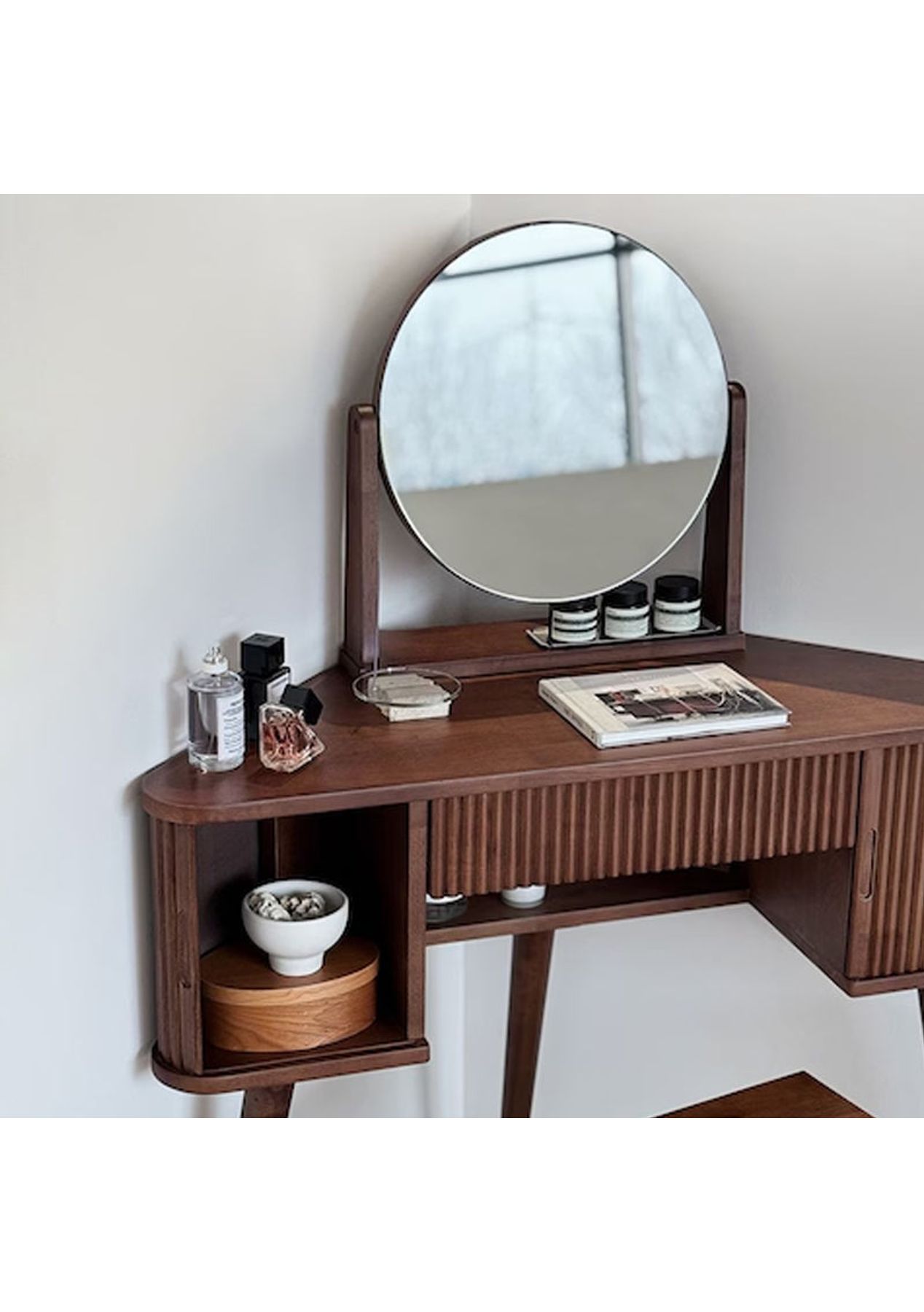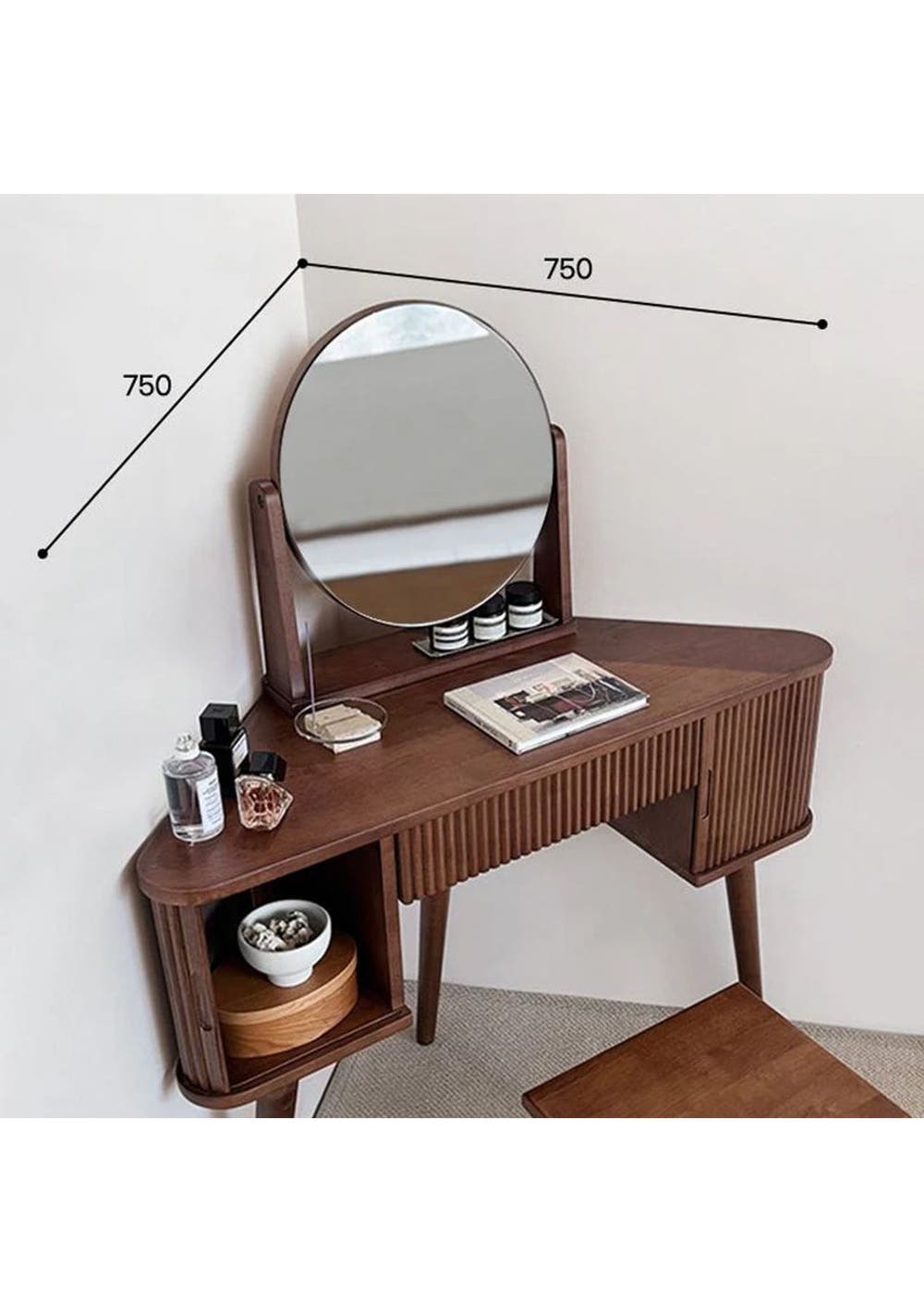 Scandinavian Corner Vanity A sleek corner vanity that saves space while adding elegance to your room. Crafted from durable rubberwood and designed with both beauty and practicality in mind. Product details ‚ Space-saving corner design perfect for small rooms. ‚ Made from sturdy, high-durability rubberwood. ‚ Tiltable round mirror with adjustable angle. ‚ Fluted detailing and warm wood tones for a Nordic-inspired look. ‚ Rounded corners for added safety. ‚ Open and closed storage for both display and organisation. ‚ Dimensions: W 1000 x D 400 x H 1220 mm ‚ Materials: Rubberwood ‚ Assembly Required: Yes(Simple the legs assembly required) ‚ Available Colours: Natural, Walnut * Please note that the colour can be different from your monitor * Package includes 1 x Dressing Table(Walnut)