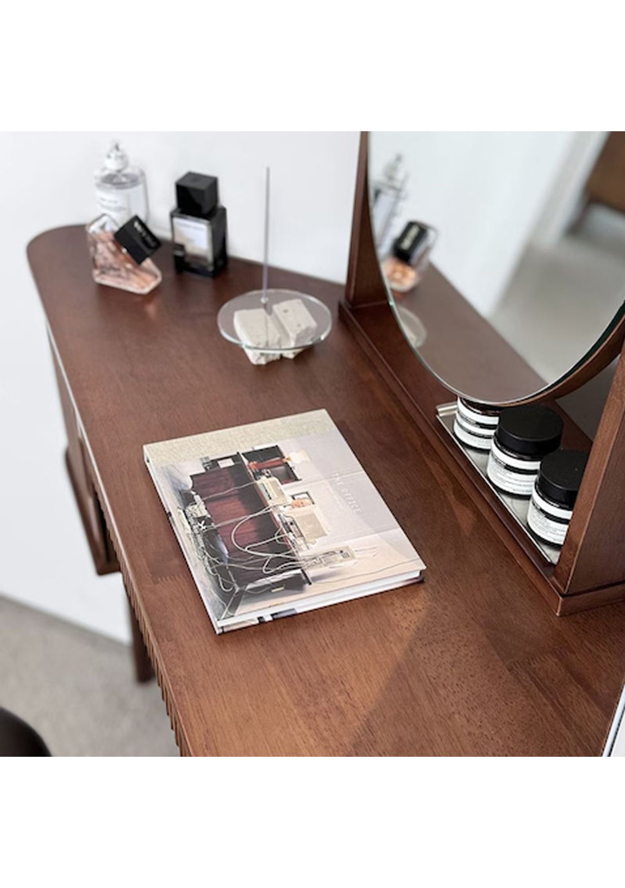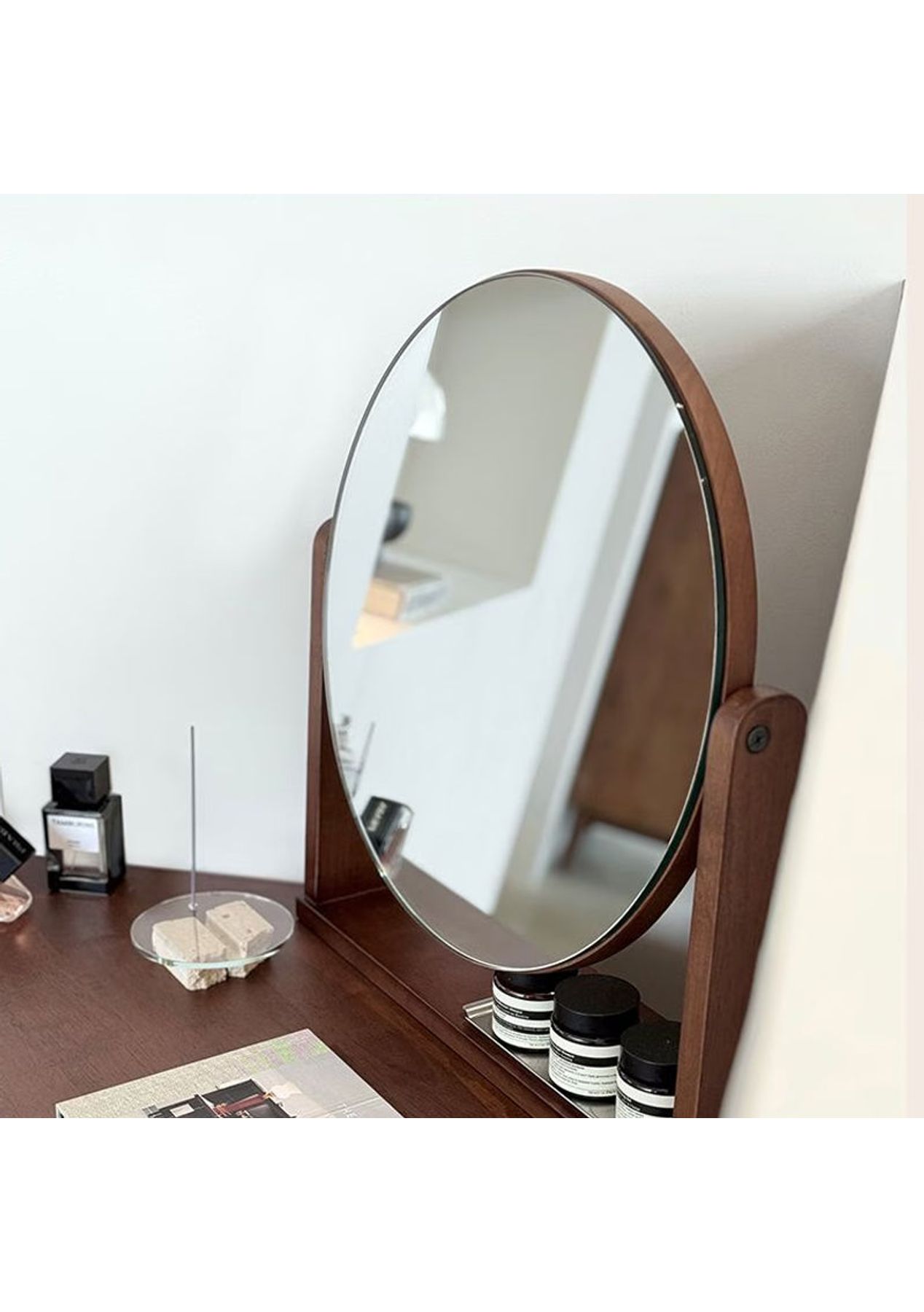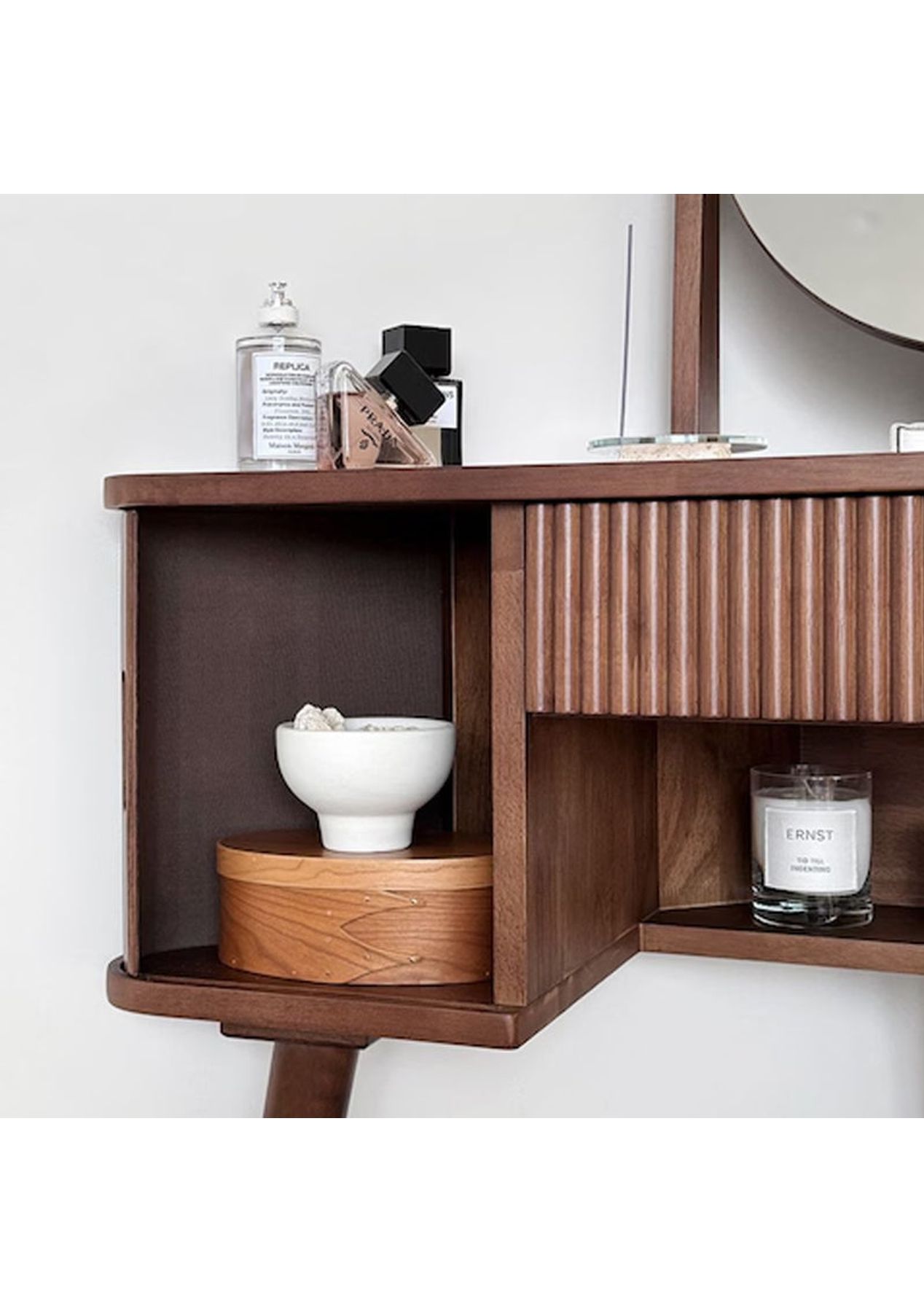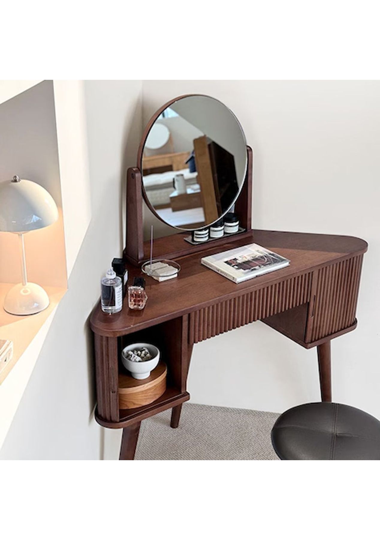 Scandinavian Corner Vanity A sleek corner vanity that saves space while adding elegance to your room. Crafted from durable rubberwood and designed with both beauty and practicality in mind. Product details ‚ Space-saving corner design perfect for small rooms. ‚ Made from sturdy, high-durability rubberwood. ‚ Tiltable round mirror with adjustable angle. ‚ Fluted detailing and warm wood tones for a Nordic-inspired look. ‚ Rounded corners for added safety. ‚ Open and closed storage for both display and organisation. ‚ Dimensions: W 1000 x D 400 x H 1220 mm ‚ Materials: Rubberwood ‚ Assembly Required: Yes(Simple the legs assembly required) ‚ Available Colours: Natural, Walnut * Please note that the colour can be different from your monitor * Package includes 1 x Dressing Table(Walnut)