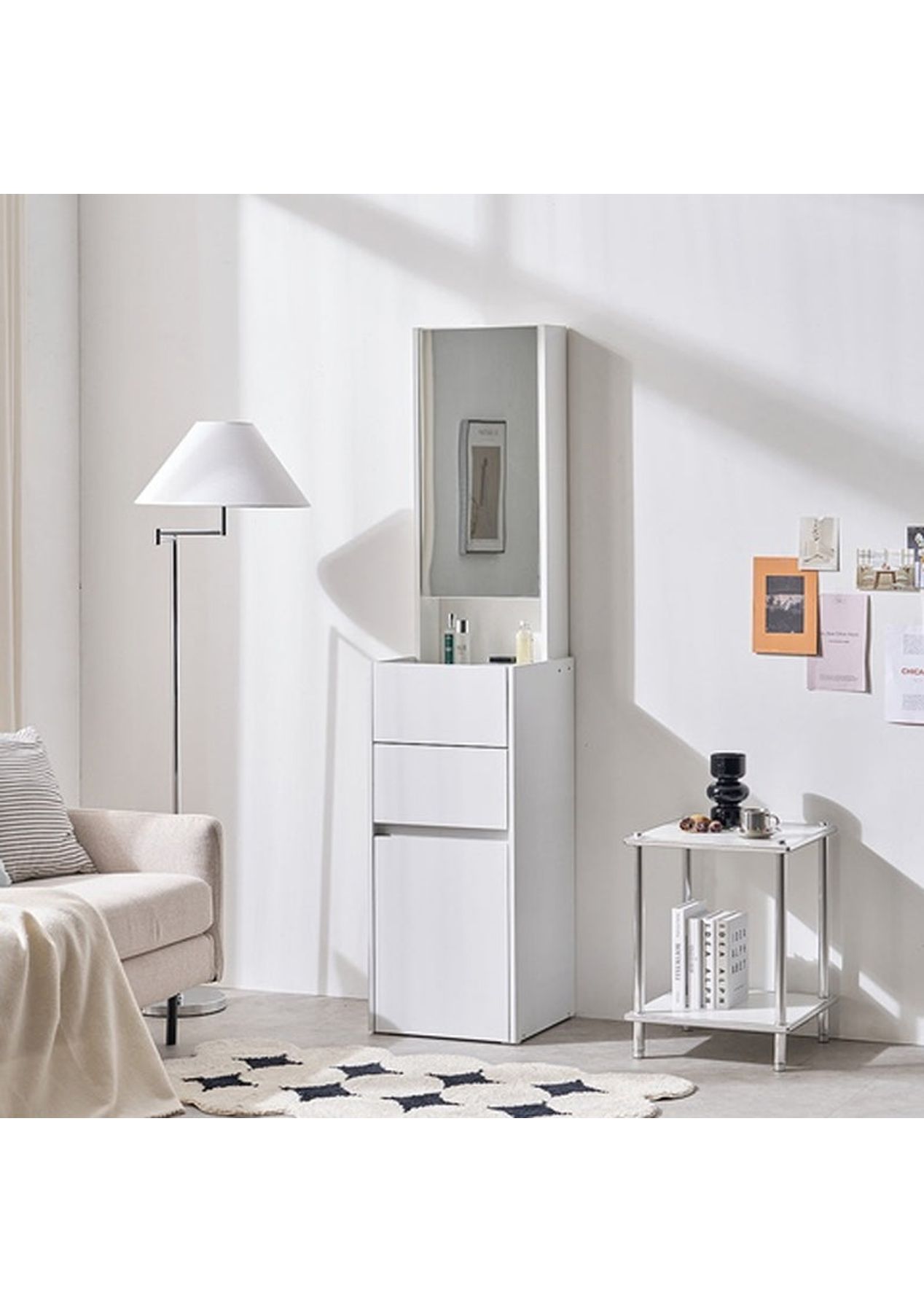 Slim Minimal Vanity with Hidden Mirror Storage for Compact Spaces A sleek and space-saving vanity designed with a clean, minimalist look and maximum storage functionality‚Äîperfect for modern interiors and small spaces. Product details ‚ Minimalist design that blends seamlessly into any room. ‚ Hidden mirror door conceals practical vertical storage. ‚ Two spacious drawers for cosmetics, accessories, and more ‚ Lower two-tier open shelves offer additional organisation. ‚ Slim structure ideal for narrow spaces like corners or bedsides. ‚ Dimensions: W 403 x D 400 x H 1780 mm ‚ Materials: MDF ‚ Assembly Required: Yes(Simple the top unit to the bottom unit fix required) ‚ Available Colour: Ivory, Oak * Please note that the colour can be different from your monitor * Package includes 1 x Dressing Table(Ivory)