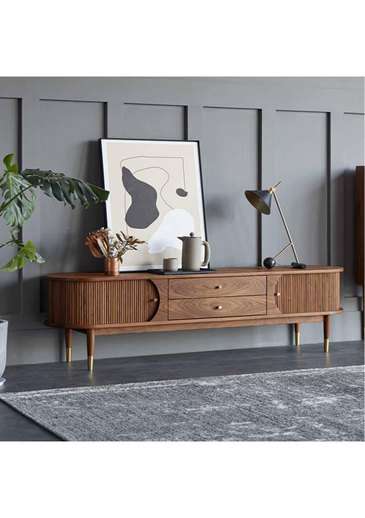 Bring bold geometric elegance to your living room with the Taiga Entertainment Unit. Crafted from high-quality solid wood, it combines natural warmth with modern style‚Äîperfect for smaller spaces needing a sleek, artistic focal point. Features‚ Bold geometric lines on the front for a modern and artistic look‚ Compact size ideal for smaller living areas without sacrificing style‚ Made from solid wood for durability, natural warmth, and timeless appeal Product Details‚ Dimensions: W 1800 D 400 H 510 mm‚ Materials: Solid wood‚ Colour: Walnut‚ Assembly Required: Yes (Simple legs assembly required) * Please note the colour may vary slightly depending on your screen settings* Package includes 1 x Entertainment Unit