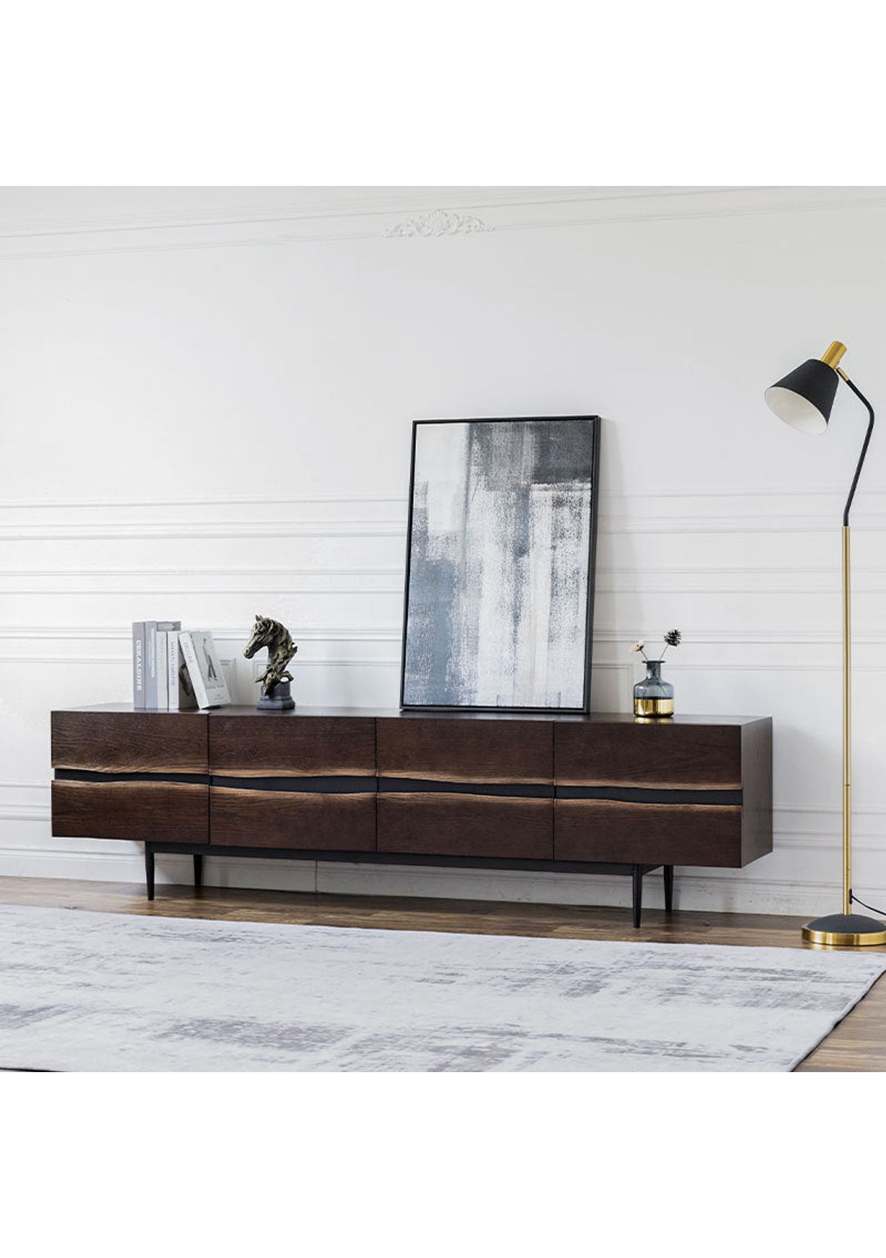 Bring a touch of natural artistry into your living space with the RIFT Entertainment Unit — where bold organic design meets minimalist elegance. The distinctive wave-cut front adds texture and character, making it a standout piece in any modern or Scandinavian-inspired interior. Features Bold minimalist design with an organic wave-cut front panel Crafted from high-quality oak wood for durability and strength Matte finish reduces glare and adds a refined, contemporary look Elevated metal legs create a light and airy feel Product Details Dimensions: W 2000 D 400 H 600 mm Materials: Oak, Metal Colour: Walnut (Matte Finish) Assembly Required: Yes (Simple legs assembly) Please note: Colour may vary slightly depending on your screen settings and lighting conditions Package includes 1 x Entertainment Unit