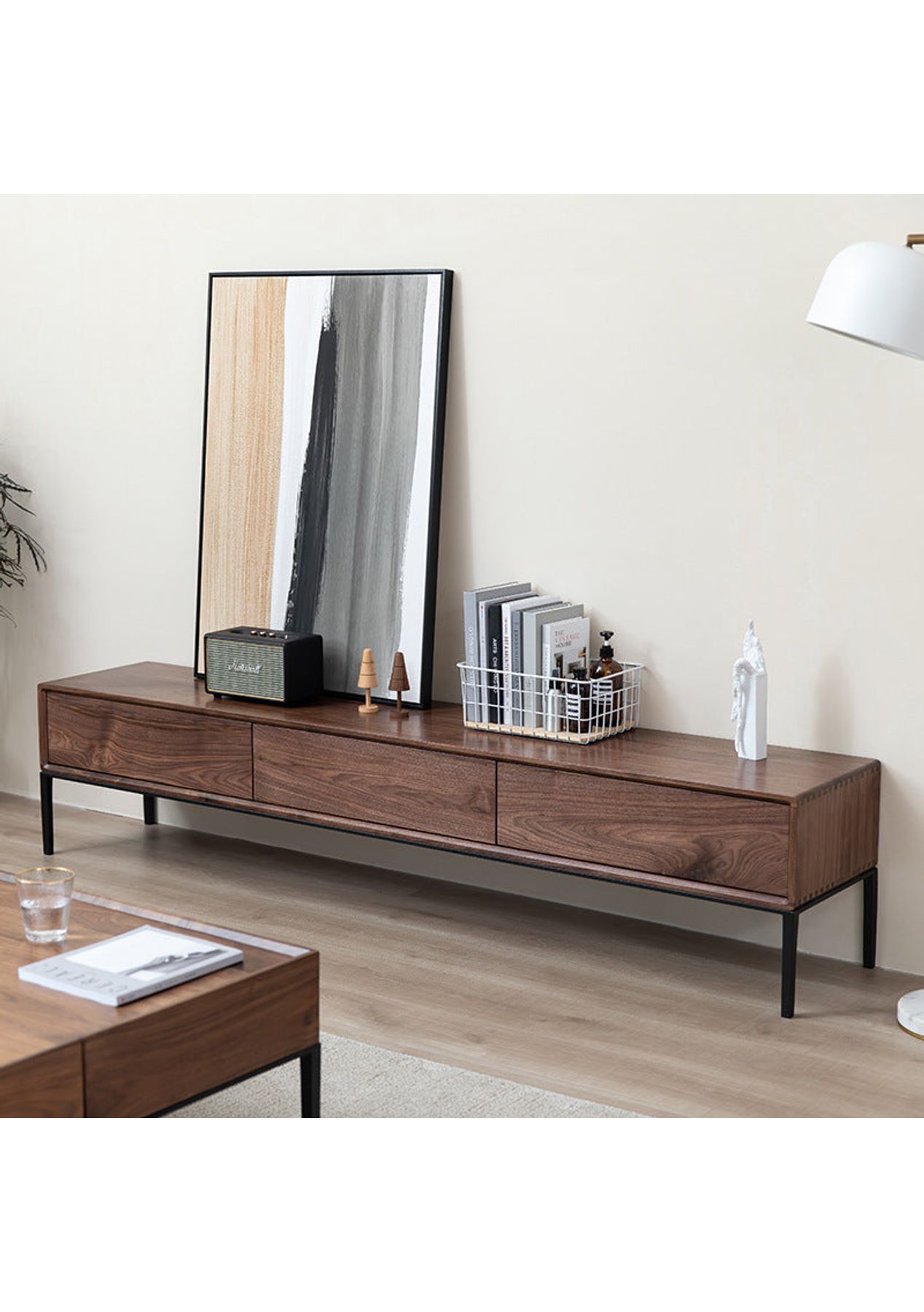 Upgrade your living space with the SIENNA Entertainment Unit ‚Äî where modern elegance meets the warmth and character of solid black walnut wood. Its handless design, rounded edges, and sleek metal legs offer a timeless look that complements contemporary, Japandi, and Scandinavian interiors. Features‚ Minimalist design with clean lines and rounded corners‚ Crafted from high-quality solid black walnut wood for strength and longevity‚ Slim black metal legs create a floating, modern aesthetic‚ Handless drawers maintain a seamless and refined look Product Details‚ Dimensions: W 2100 D 400 H 450 mm‚ Materials: Solid black walnut wood, metal legs‚ Colour: Walnut ‚ Assembly Required: Yes (Simple legs assembly) Please note: Colour may vary slightly depending on your screen settings and lighting conditions Package includes 1 x Entertainment Unit