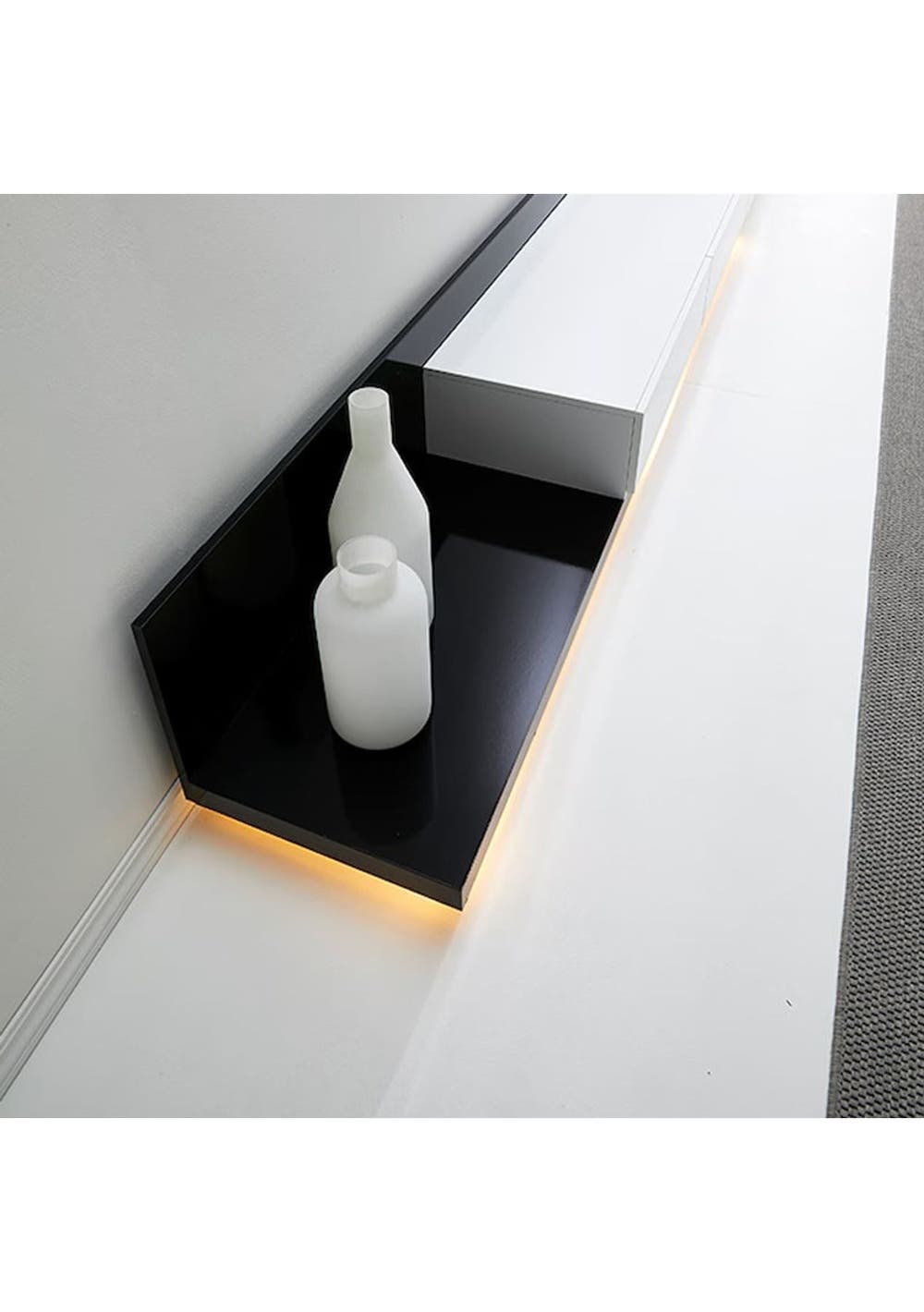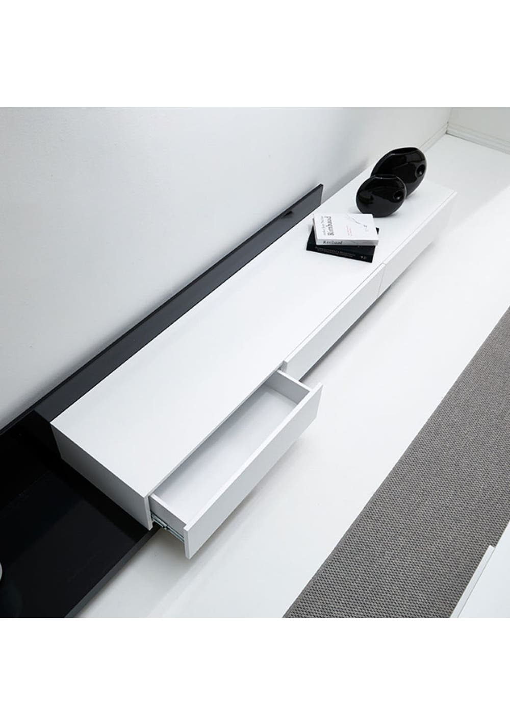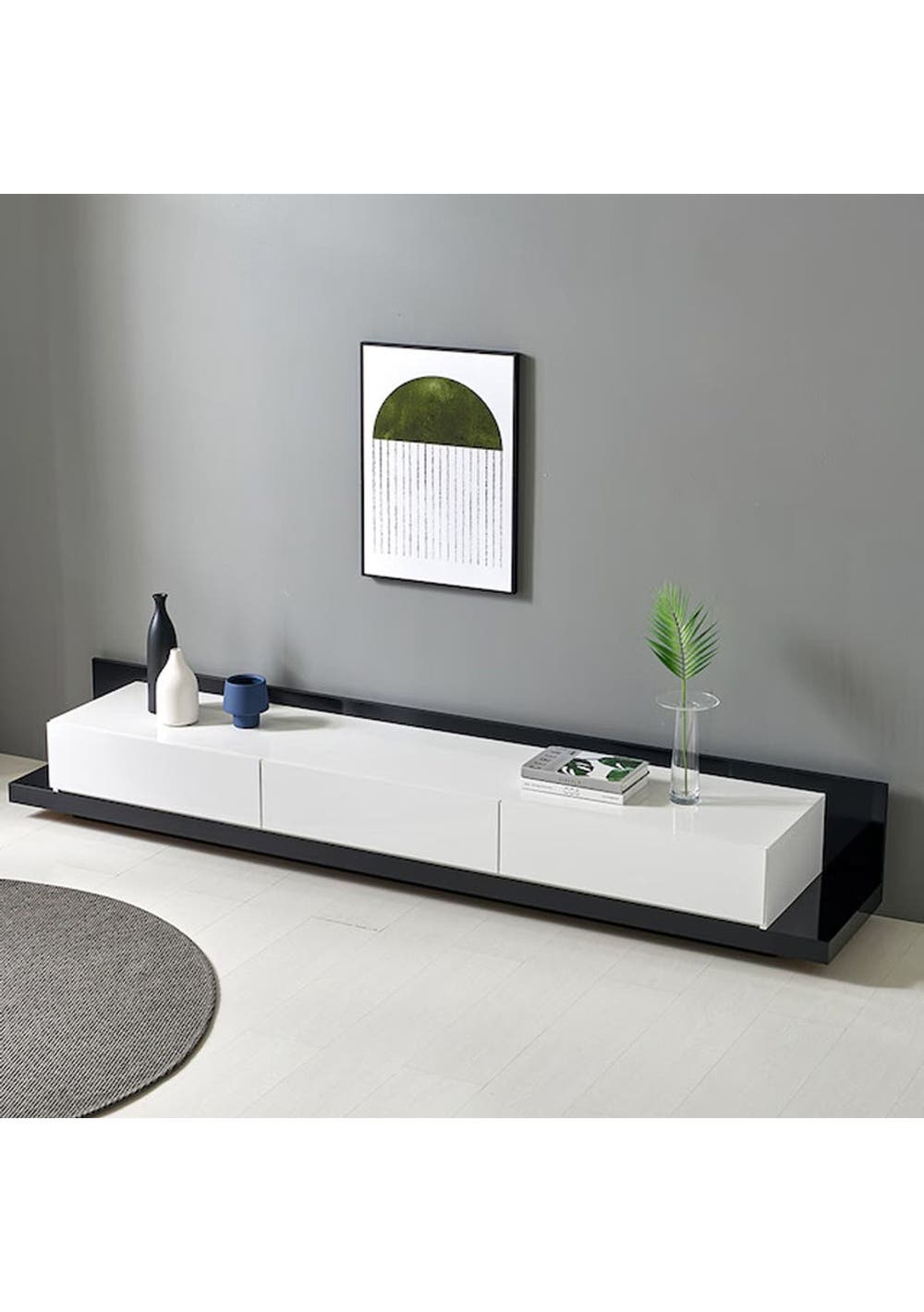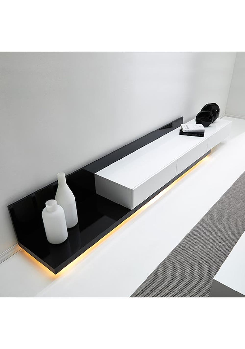 Features:‚ Modern and simple design‚ Sturdy and durable‚ Extendable‚ Handless drawers‚ LED light‚ Select the Left or Right power socketProduct details:‚ Dimensions: W 2300 ~ 3300 X D 415 X H 350 mm‚ Materials: LPM, MDF, PB, Ball rail‚ Assembly required: Yes(Simple base & back board assembly required)‚ Colour: White & Black* Please note that the colour can be different from your monitor* Package includes 1 x Entertainment Unit
