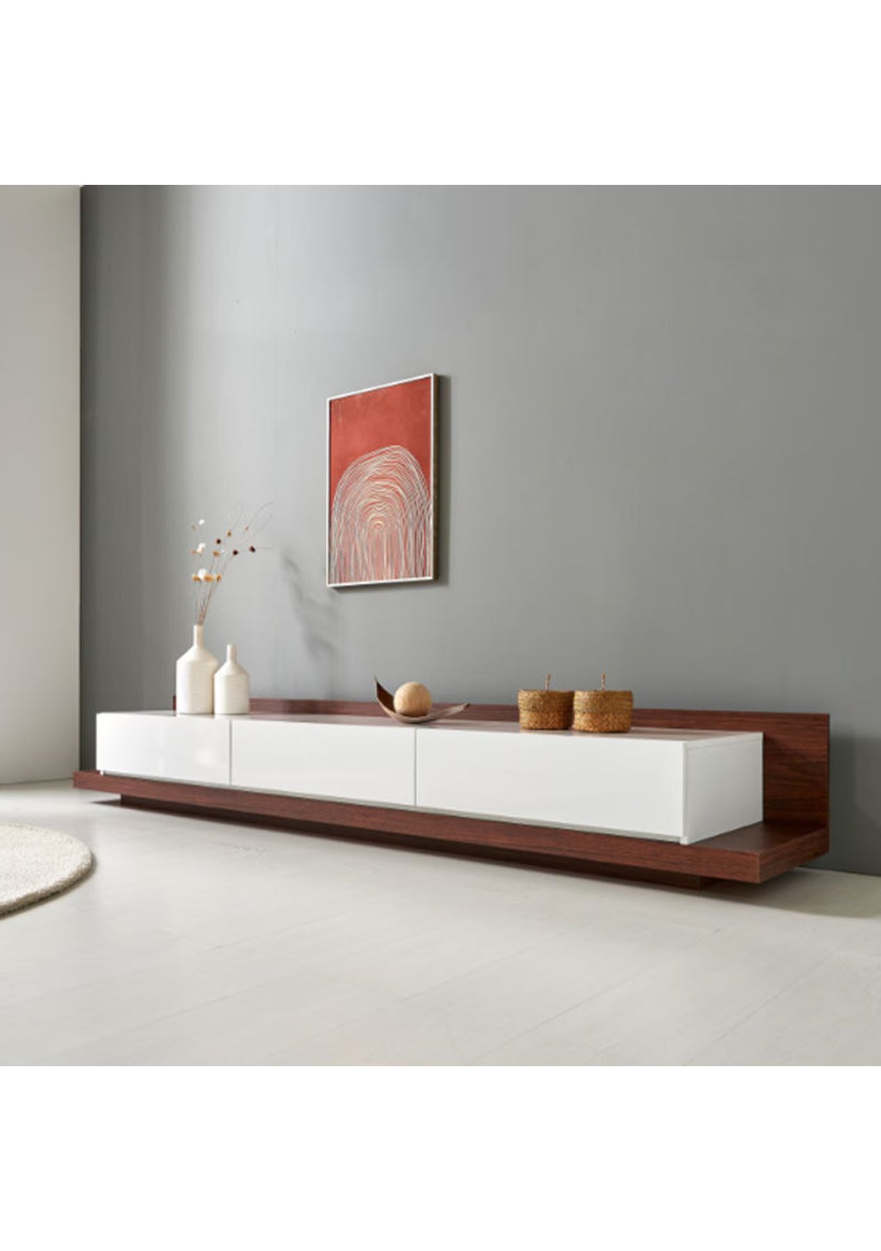 Features:‚ Modern and simple design‚ Sturdy and durable‚ Extendable‚ Handless drawers‚ LED light‚ Select the Left or Right power socketProduct details:‚ Dimensions: W 2300 ~ 3300 X D 415 X H 350 mm‚ Materials: LPM, MDF, PB, Ball rail‚ Assembly required: Yes(Simple base & back board assembly required)‚ Colour: White & Walnut* Please note that the colour can be different from your monitor* Package includes 1 x Entertainment Unit