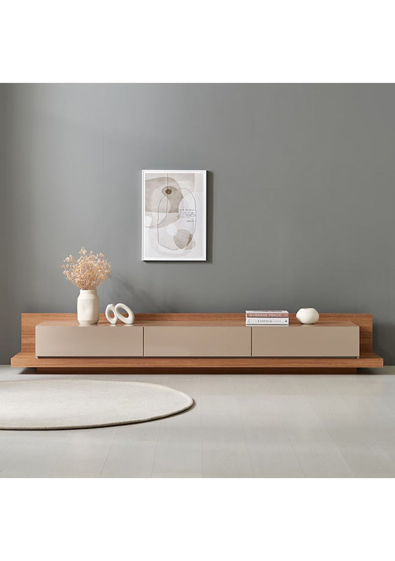 Features:‚ Modern and simple design‚ Sturdy and durable‚ Extendable‚ Handless drawers‚ LED light‚ Select the Left or Right power socketProduct details:‚ Dimensions: W 2300 ~ 3300 X D 415 X H 350 mm‚ Materials: LPM, MDF, PB, Ball rail‚ Assembly required: Yes(Simple base & back board assembly required)‚ Colour: Grey & Walnut* Please note that the colour can be different from your monitor* Package includes 1 x Entertainment Unit