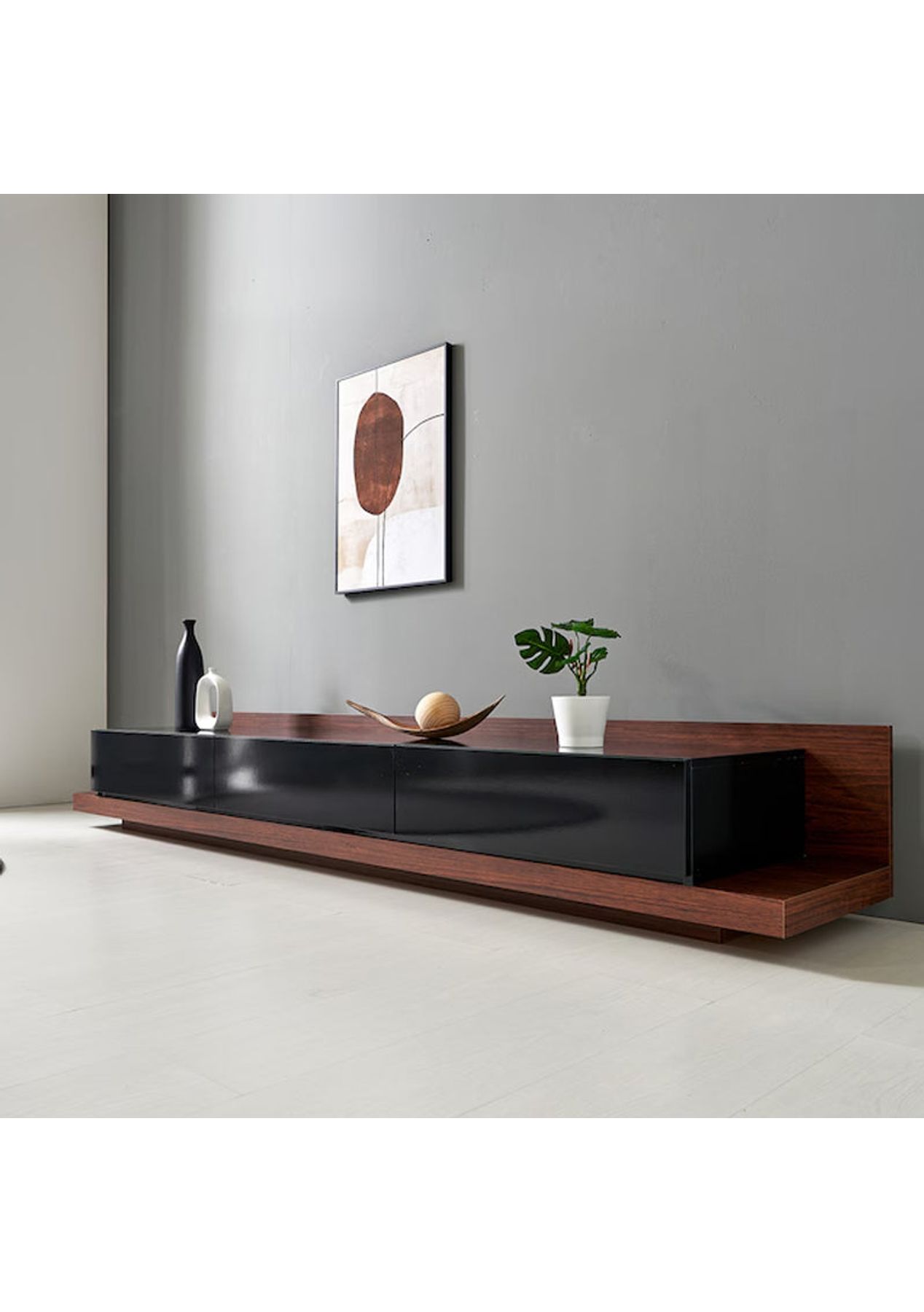 Features:‚ Modern and simple design‚ Sturdy and durable‚ Extendable‚ Handless drawers‚ LED light‚ Select the Left or Right power socketProduct details:‚ Dimensions: W 2300 ~ 3300 X D 415 X H 350 mm‚ Materials: LPM, MDF, PB, Ball rail‚ Assembly required: Yes(Simple base & back board assembly required)‚ Colour: Black & Walnut* Please note that the colour can be different from your monitor* Package includes 1 x Entertainment Unit