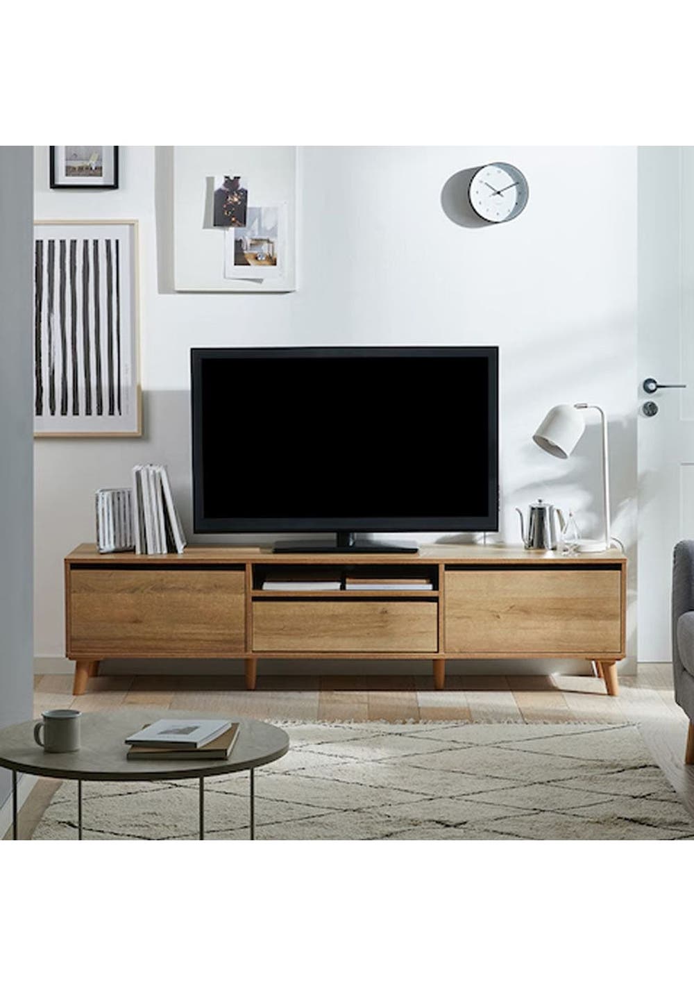 Modern wooden TV cabinet with storage ‚Äì handleless drawers, Scandinavian design, practical height, and stylish tapered legs. Perfect for organising electronics, books, and home dcor in your living room. Features ‚ Handleless drawers for a clean, modern look ‚ Easy to open with grip-style drawer tops ‚ Ideal for compact spaces with a clean and functional design Product Details ‚ Dimension: W 1790 x D 390 x H 450 mm ‚ Materials: MDF(Body), Polypropylene(legs) ‚ Assembly Required: Yes(Simple legs assembly required) ‚ Colour: White, Natural * Please note that the colour can be different from your monitor * Package includes 1 x Entertainment Unit