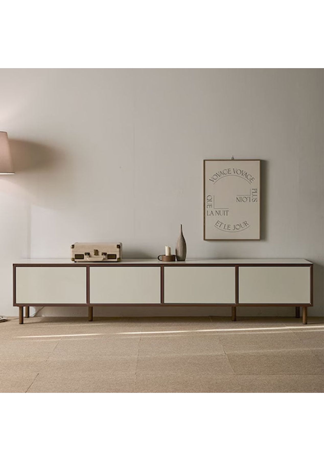Elevate your living room with this modern TV cabinet that blends sleek functionality with a warm wood-accented frame. Designed for both style and convenience, it offers clean lines, ample storage, and thoughtful features for everyday use. Features ‚ Natural wood-look trim adds a touch of elegance and warmth ‚ Soft-close hinges ensure smooth and quiet door movement ‚ Handle-free, push-to-open doors enhance the minimalist design ‚ Built-in dual cable holes keep wires neatly organised ‚ Perfect for modern or Scandinavian-style interiors Product Details ‚ Dimension: W 2100 x D 400 x H 430 mm ‚ Materials: MDF ‚ Assembly Required: Yes(Simple legs assembly required) ‚ Available Colours: Oak, Walnut * Please note that the colour can be different from your monitor * Package includes 1 x Entertainment Unit