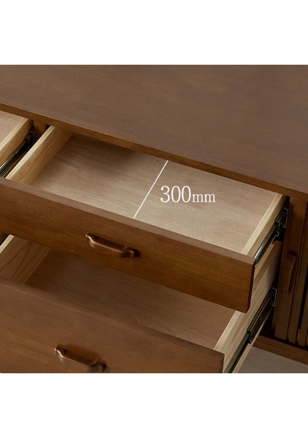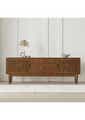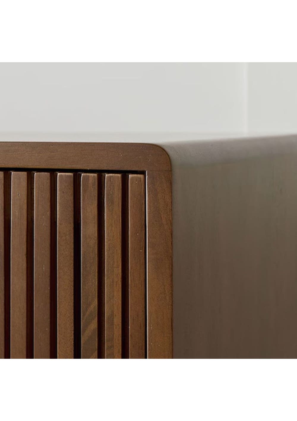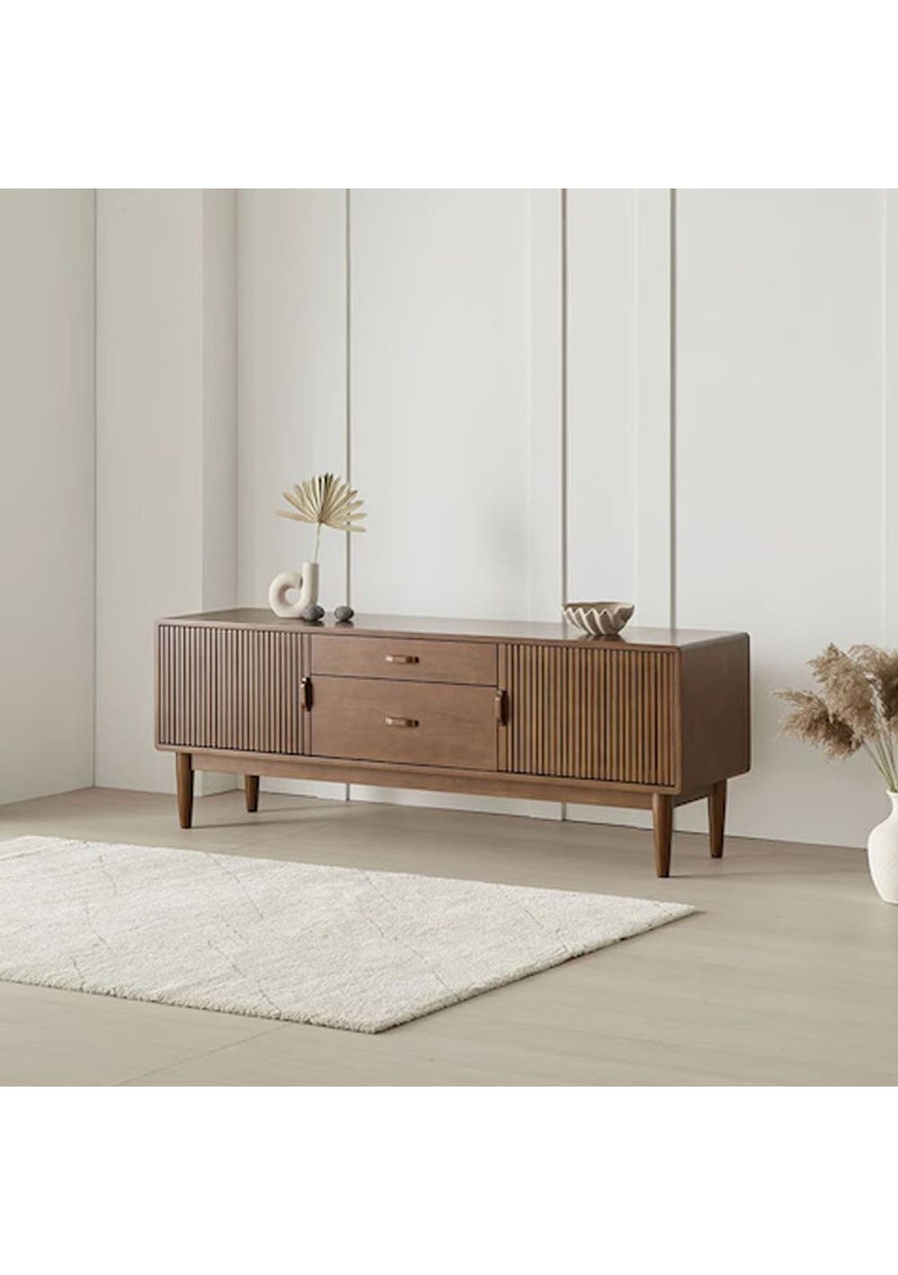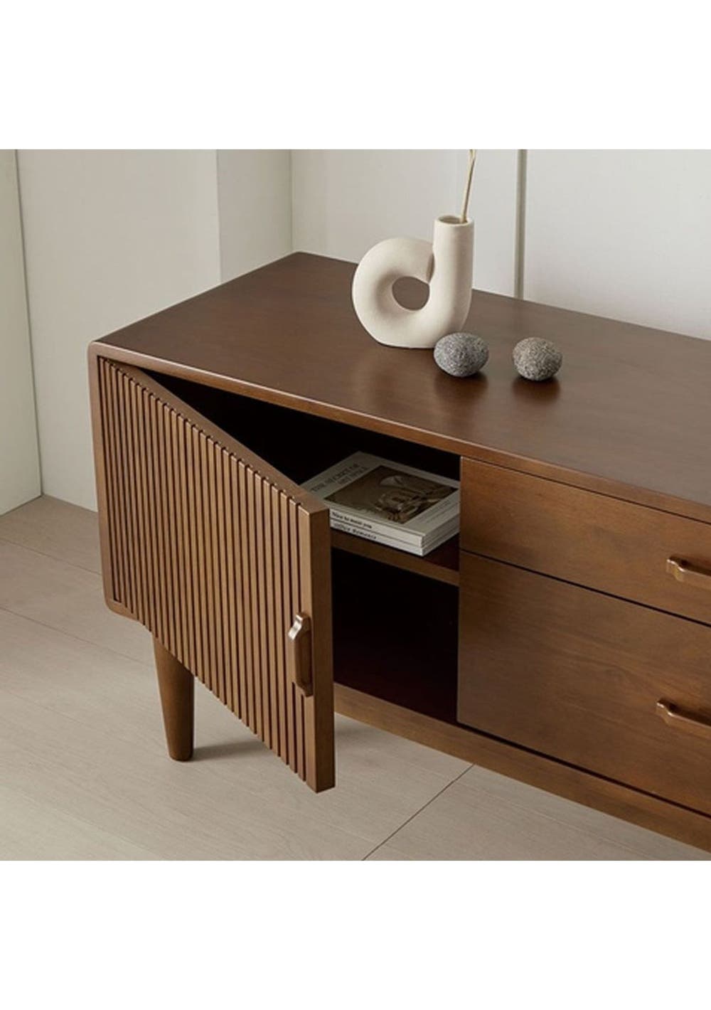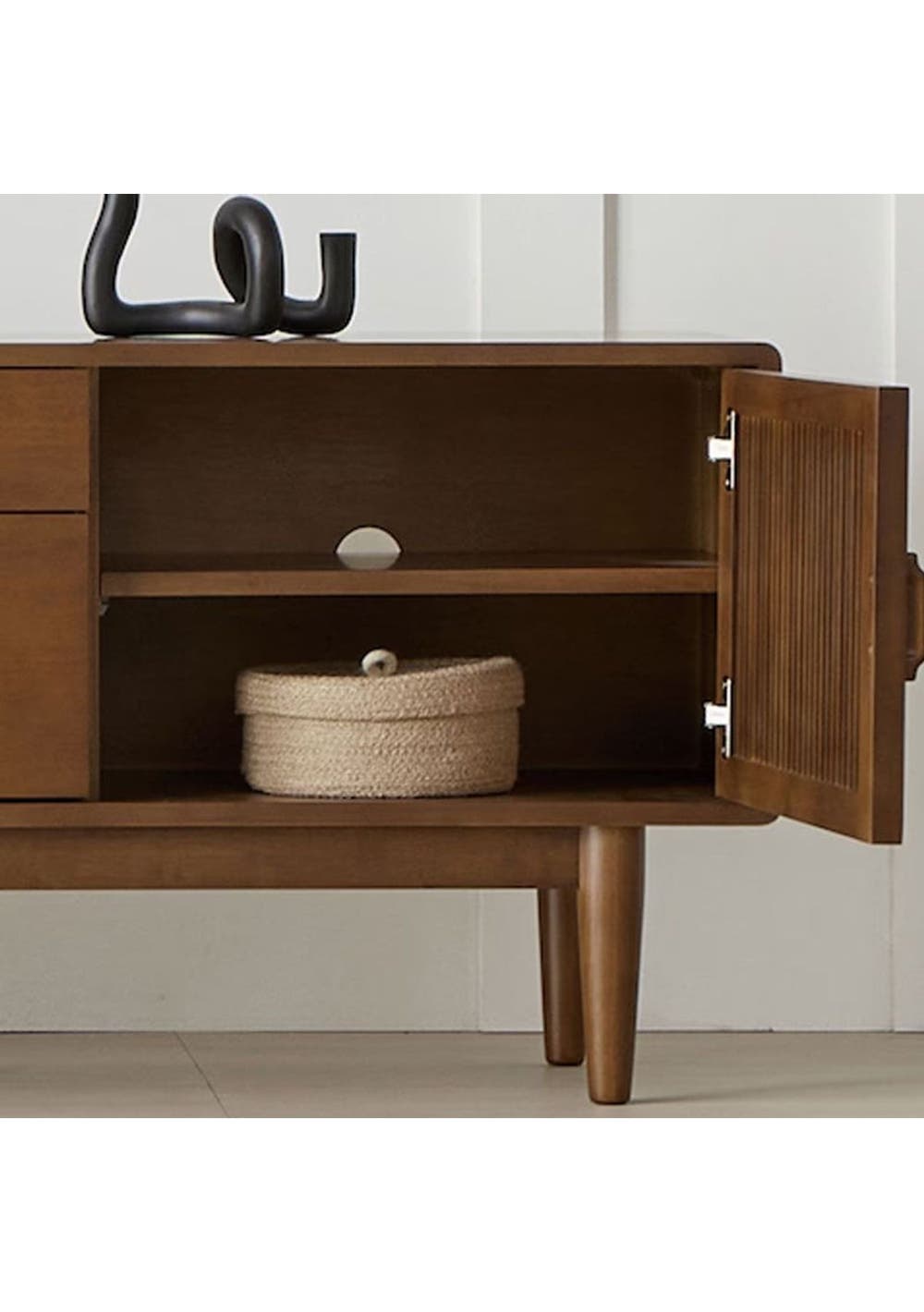 A stylish mid-century modern TV cabinet that brings warmth and sophistication to your living space. Solid rubberwood with elegant details and functional storage. Features ‚ Mid-century inspired design for a timeless and retro feel ‚ Vertical slatted doors for a refined and textured look ‚ Adjustable interior shelf for storage space ‚ Soft-close doors for smooth and quiet operation ‚ Built-in cable holes to keep wires neat and organised Product Details ‚ Dimension: W 1600 x D 400 x H 570 mm ‚ Materials: Rubberwood ‚ Assembly Required: Yes(Simple legs assembly required) ‚ Colour: Walnut * Please note that the colour can be different from your monitor * Package includes 1 x Entertainment Unit