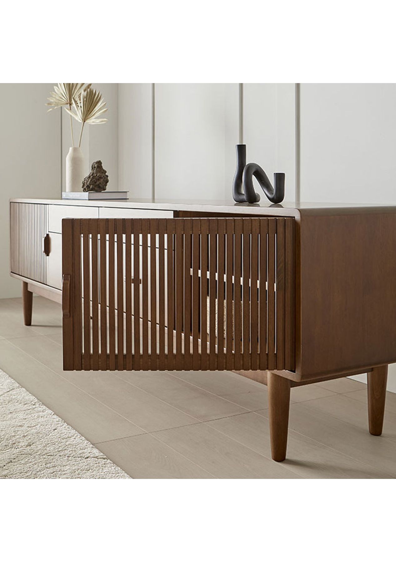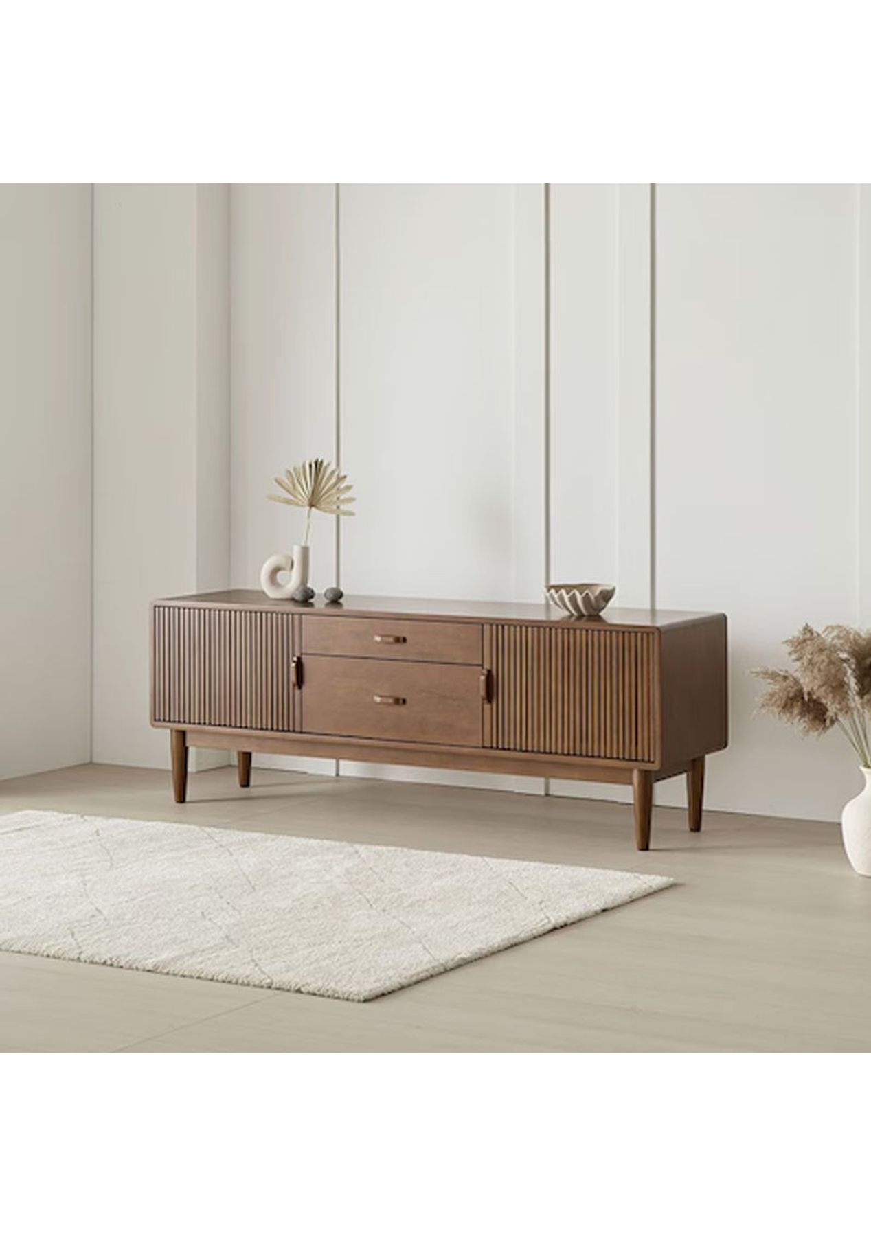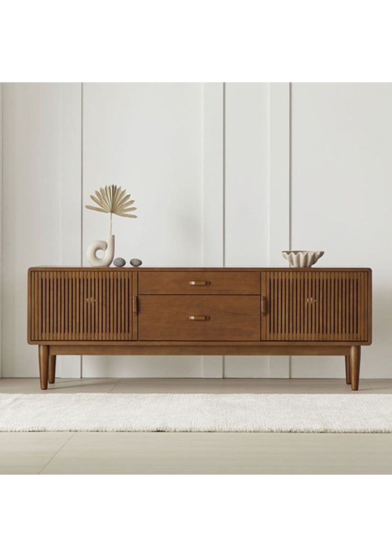 A stylish mid-century modern TV cabinet that brings warmth and sophistication to your living space. Solid rubberwood with elegant details and functional storage. Features ‚ Mid-century inspired design for a timeless and retro feel ‚ Vertical slatted doors for a refined and textured look ‚ Adjustable interior shelf for storage space ‚ Soft-close doors for smooth and quiet operation ‚ Built-in cable holes to keep wires neat and organised Product Details ‚ Dimension: W 1600 x D 400 x H 570 mm ‚ Materials: Rubberwood ‚ Assembly Required: Yes(Simple legs assembly required) ‚ Colour: Walnut * Please note that the colour can be different from your monitor * Package includes 1 x Entertainment Unit