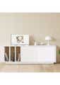 Sliding Door cabinet with LP & Book Storage This minimalist sliding door cabinet offers the perfect balance of open display and hidden storage. Ideal for LP collections, magazines, or living room essentials, it fits effortlessly into modern interiors with its clean lines and functional design. Choose from a warm natural oak finish or a clean white tone to match your space. Features ‚ Space-saving doors glide smoothly on durable aluminum tracks, making it ideal for compact living rooms or media setups. ‚ LP & Magazine Storage Cabinet ‚Äì Open vertical compartments hold your favorite vinyl records, books, or magazines beautifully. ‚ Thick 18mm Frame ‚Äì Built with solid, bend-resistant panels for long-lasting durability and structure. ‚ Adjustable Shelves Inside ‚ Aluminium-Coated Handles ‚Äì Scratch-resistant and stylish, with extra coating for enhanced durability. ‚ Scratch-Proof Base Legs ‚Äì Stable footing that protects floors from scuffs or damage. Product Details ‚ Dimension: W 1800 x D 400 x H 627 mm ‚ Materials: MDF, Aluminium ‚ Assembly Required: Yes(Simple handles assembly required) ‚ Colour: White * Please note that the colour can be different from your monitor * Package includes 1 x Entertainment Unit