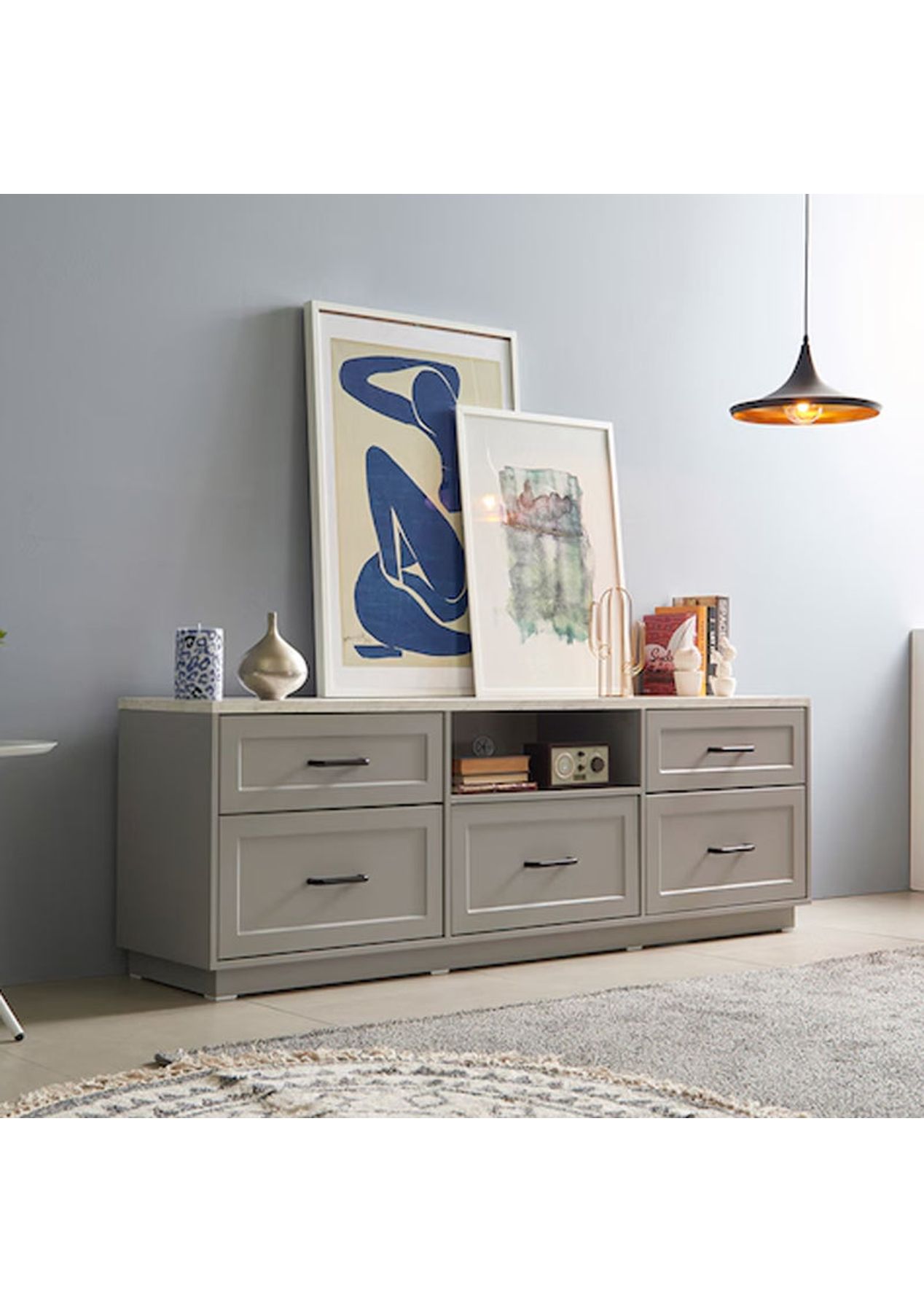 Blending classic elegance with modern sensibility, this TV unit features a unique marble-patterned top and framed molding design that elevates any space. Whether in soft ivory or chic grey, it brings both warmth and sophistication to your living room. Features ‚ TV Console with Drawers ‚Äì Designed for style and storage, this media sideboard keeps electronics, books, and daily items organised. ‚ Elegant molding details offers classic and contemporary interiors. ‚ The marble-patterned surface adds a luxurious touch while being durable and easy to clean. ‚ Modern Black Steel Handles ‚Äì Sleek, minimal handles complete the modern aesthetic. ‚ Durable Finish ‚Äì Reinforced with a laminated marble-pattern sheet and a protective coating for long-term durability. ‚ Perfect as a TV Stand, Sideboard, or Entryway Cabinet ‚Äì A functional and stylish storage solution for any room. Product Details ‚ Dimension: W 1800 x D 400 x H 600 mm ‚ Materials: MDF ‚ Assembly Required: Yes(Simple handles assembly required) ‚ Colour: Grey * Please note that the colour can be different from your monitor * Package includes 1 x Entertainment Unit
