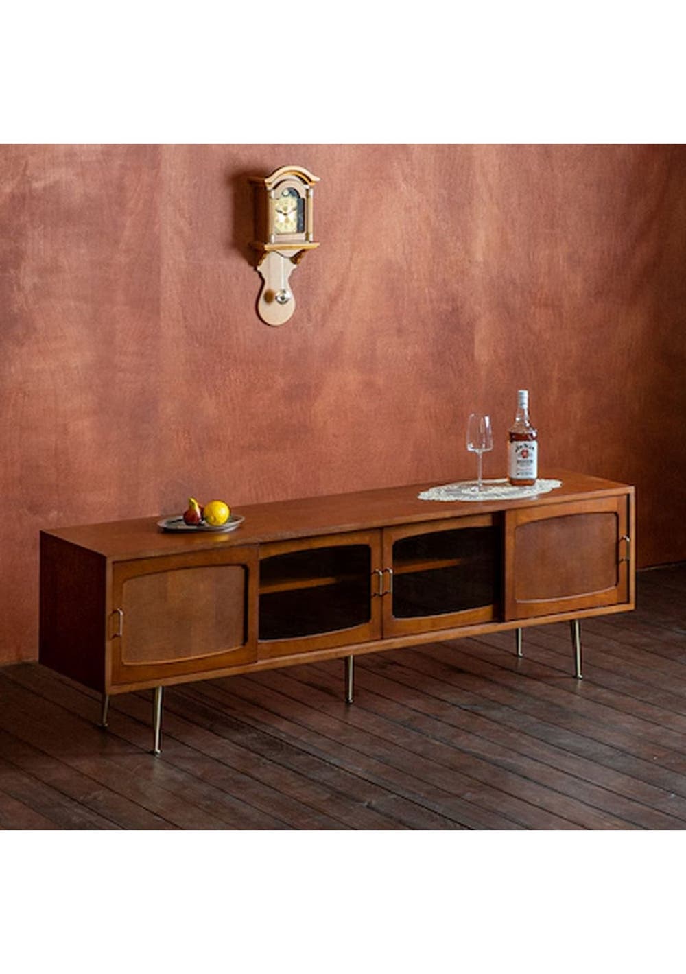 Vintage-Inspired Solid Rubberwood TV Cabinet with Bronze Glass & Metal Accents Enhance your living space with this elegantly crafted TV cabinet, where straight lines and soft curves harmonize to create a timeless vintage aesthetic. Featuring solid rubberwood, bronze-tinted glass, and metal details, this piece offers both function and charm to elevate any room‚Äôs ambiance. Features ‚ Crafted from solid rubberwood for durability and natural warmth. ‚ Features bronze-tinted glass doors that offer a vintage aesthetic. ‚ Combines clean lines and curved edges for a balanced, retro-modern look. ‚ Designed with angled metal legs for stability and mid-century style. ‚ Fitted with matching metal handles that enhance the antique vibe. ‚ Includes a rear cable hole for easy wire organisation. Product Details ‚ Dimension: W 1800 x D 400 x H 530 mm ‚ Materials: Rubberwood, Bronze-tinted glass, Steel ‚ Assembly Required: Yes(Simple handles & legs assembly required) ‚ Colour: Walnut * Please note that the colour can be different from your monitor * Package includes 1 x Entertainment Unit