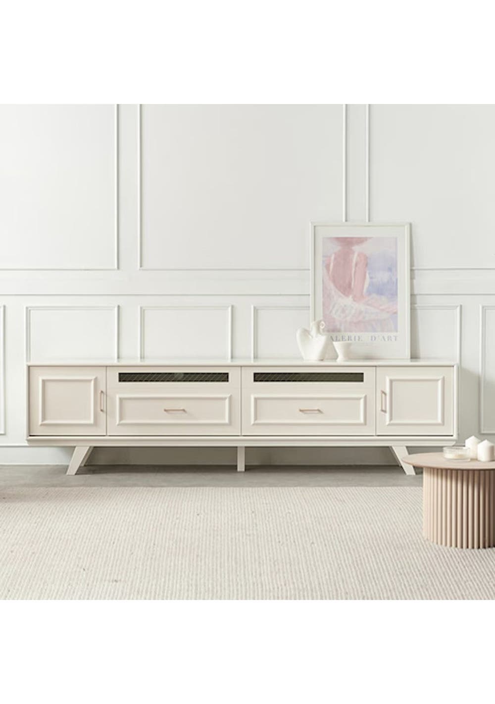 Elegant French Modern TV Unit Discover the perfect blend of classic French elegance and modern minimalism with this beautifully designed ivory tv unit. With refined wainscoting details and soft gold accents, this piece is crafted to elevate your space with warmth, charm, and functionality. Features ‚ Premium wainscoting details enhance the sophistication and visual texture of the furniture. ‚ The soft ivory color creates a cozy and inviting atmosphere, perfect for any interior style. ‚ Sleek gold handles add a refined accent, harmonising beautifully with the overall minimalist design. ‚ Smooth-gliding drawers are easy to use and enhance everyday convenience. ‚ A perfect choice for modern homes looking to incorporate French-style charm with subtle luxury. Product Details ‚ Dimension: W 2190 x D 400 x H 575 mm ‚ Materials: Cedarwood ‚ Assembly required: Yes(Simple the legs & handles assembly required) ‚ Available colour: Ivory * Please note that the colour can be different from your monitor * Package includes 1 x Entertainment Unit