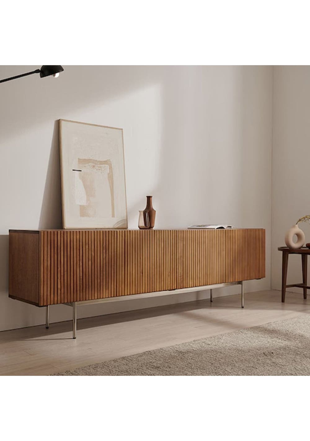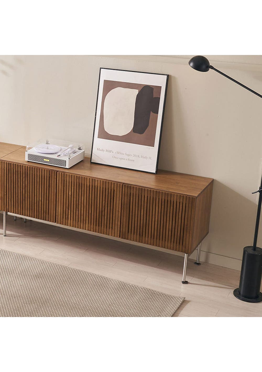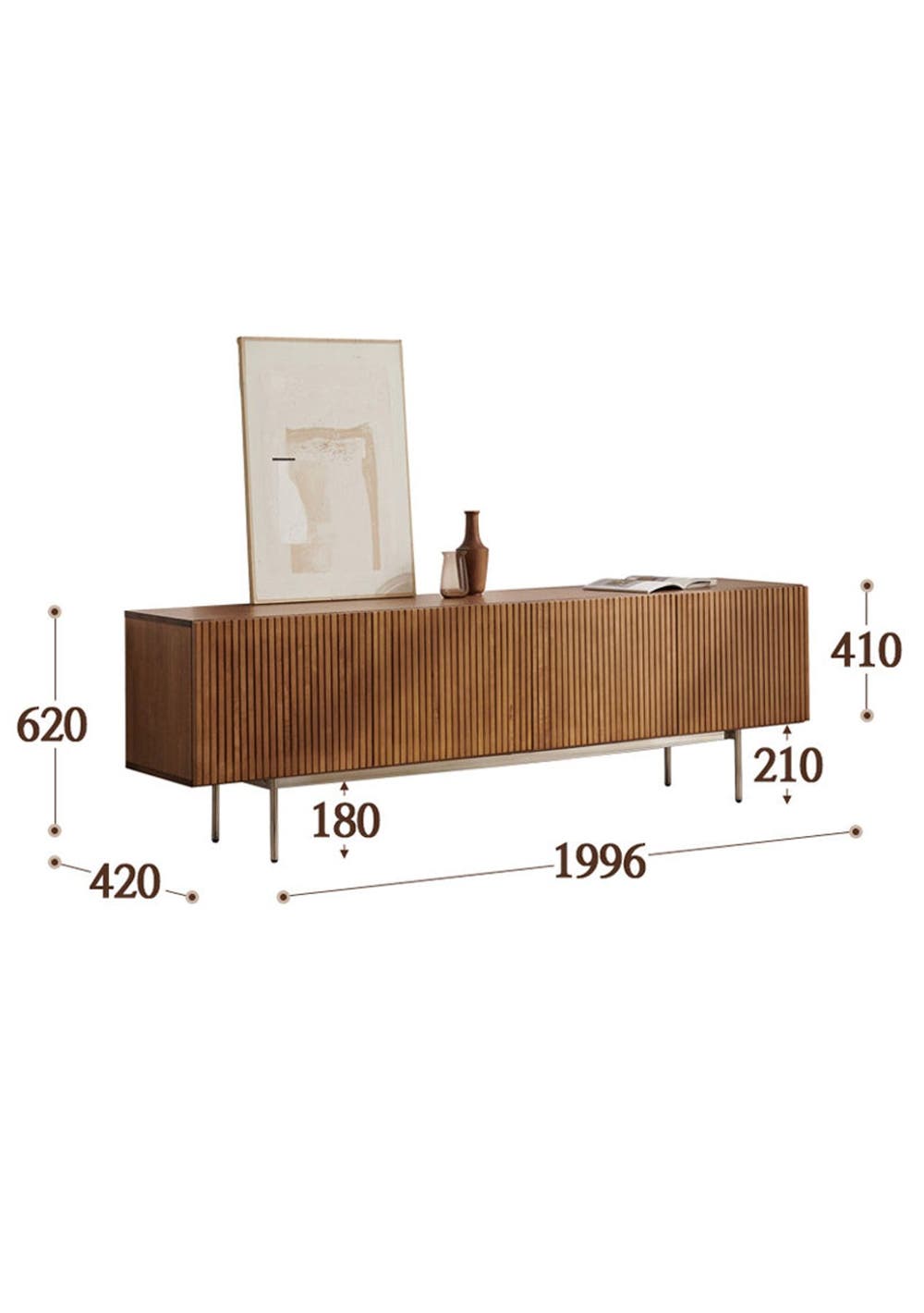 This wooden TV console brings understated sophistication to your living space with its refined silhouette and natural textures. The vertical slatted doors add depth and visual interest, casting subtle shadows that enhance the room's atmosphere. Features ‚ Vertical slatted doors create a refined, textured look with elegant shadows. ‚ Spacious interior shelves provide practical storage for electronics, books, or decor ‚ Allows seamless remote signal access even with doors closed. ‚ Warm natural wood tone blends beautifully with a variety of interiors. ‚ Made of solid rubberwood and MDF for durability and lasting structure. ‚ Slim metal legs offer a clean, airy feel and easy floor cleaning access. ‚ A minimalist design that doubles as both functional storage and a decorative centerpiece. Product Details ‚ Dimension: W 2000 x D 420 x H 620 mm ‚ Materials: Rubberwood, MDF ‚ Assembly Required: Yes(Simple legs assembly required) ‚ Colour: Walnut * Please note that the colour can be different from your monitor * Package includes 1 x Entertainment Unit