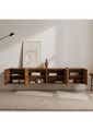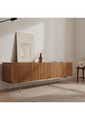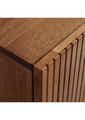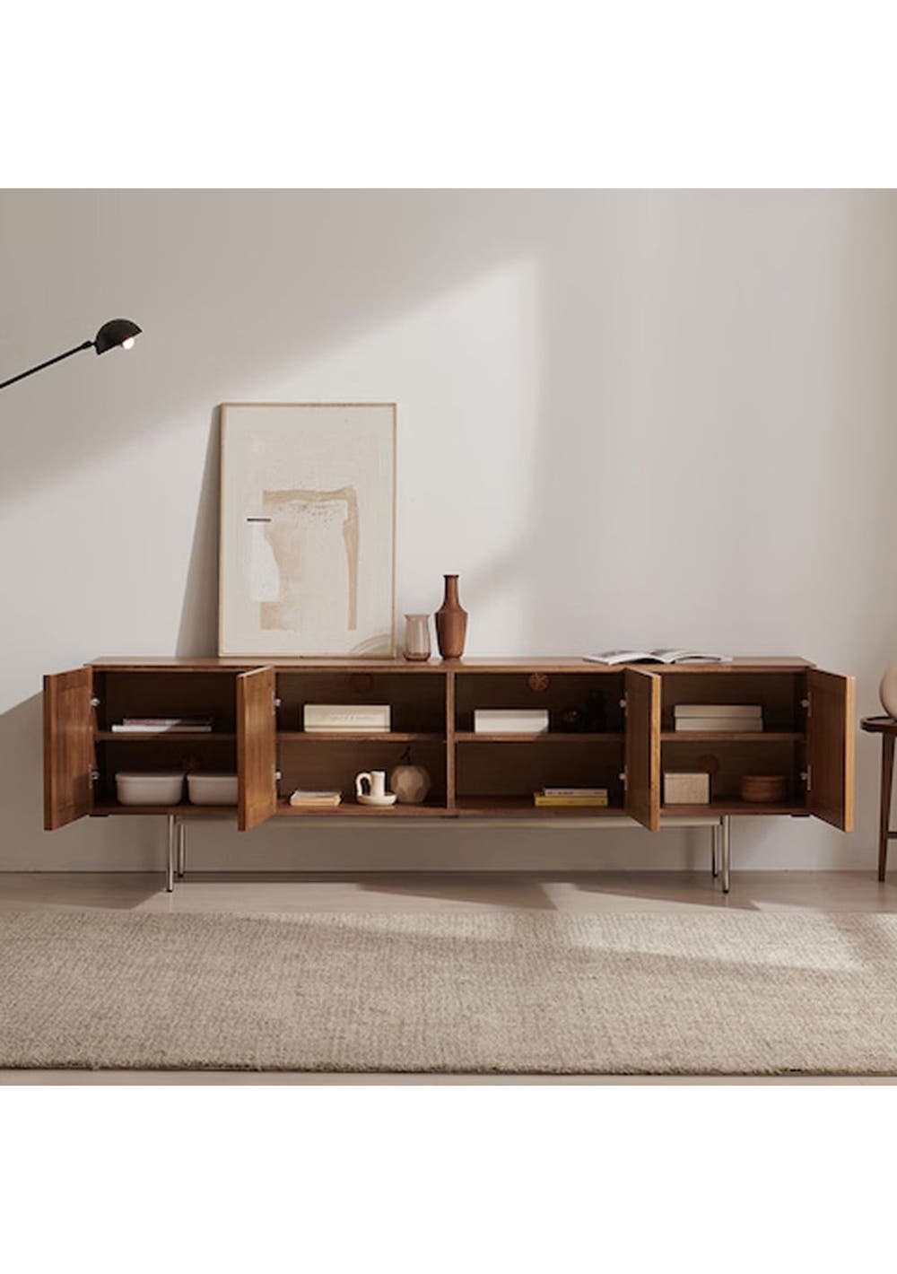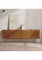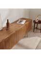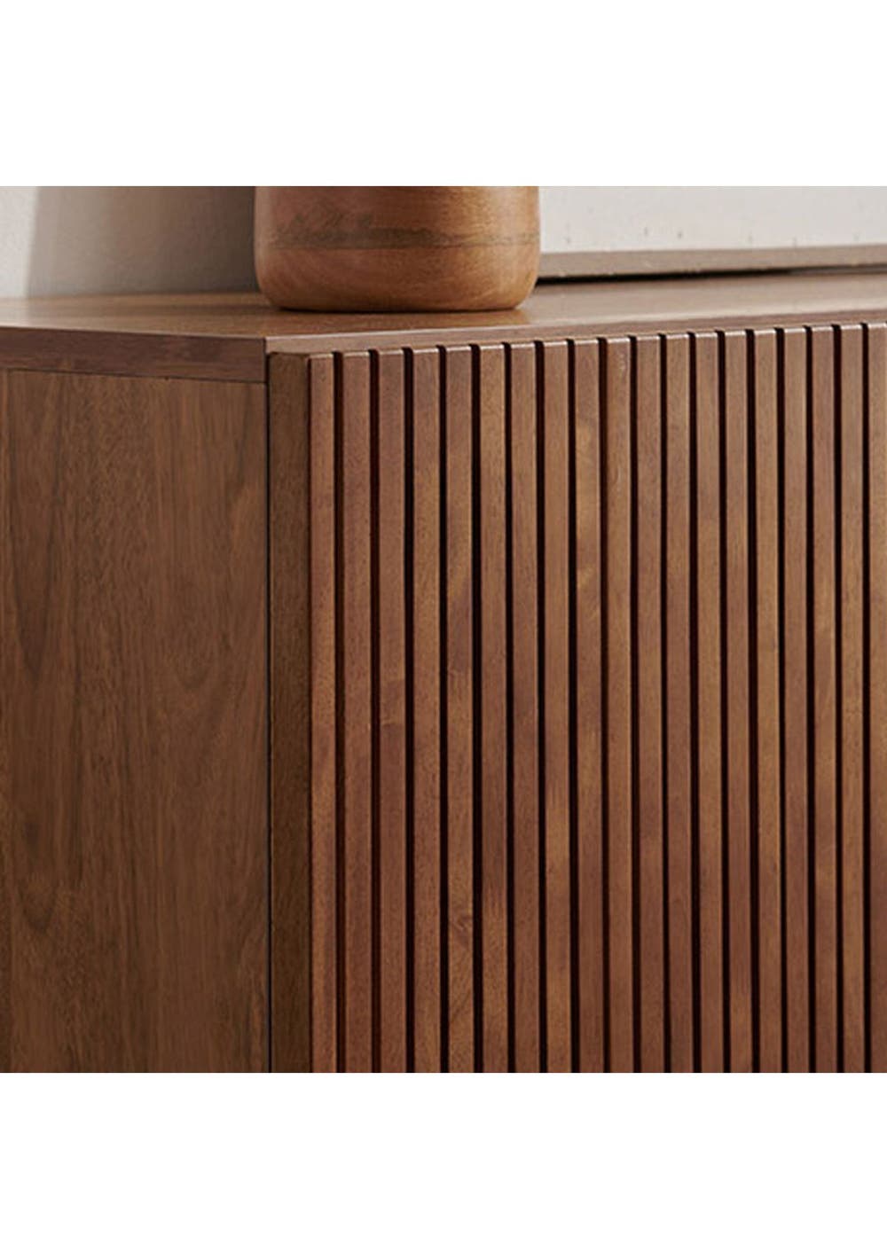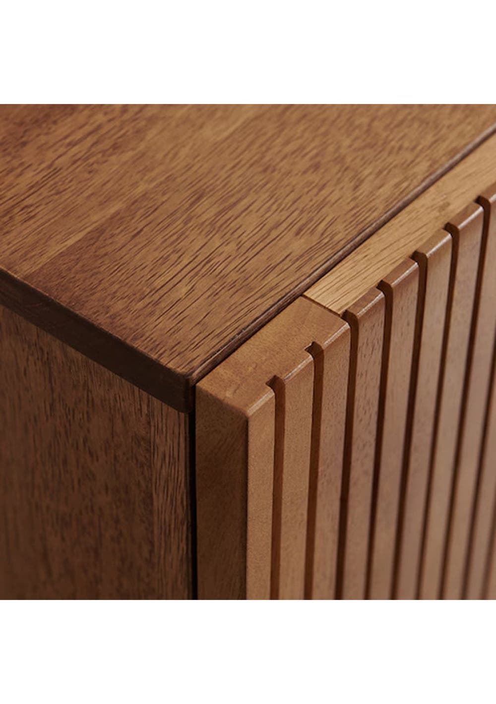 This wooden TV console brings understated sophistication to your living space with its refined silhouette and natural textures. The vertical slatted doors add depth and visual interest, casting subtle shadows that enhance the room's atmosphere. Features ‚ Vertical slatted doors create a refined, textured look with elegant shadows. ‚ Spacious interior shelves provide practical storage for electronics, books, or decor ‚ Allows seamless remote signal access even with doors closed. ‚ Warm natural wood tone blends beautifully with a variety of interiors. ‚ Made of solid rubberwood and MDF for durability and lasting structure. ‚ Slim metal legs offer a clean, airy feel and easy floor cleaning access. ‚ A minimalist design that doubles as both functional storage and a decorative centerpiece. Product Details ‚ Dimension: W 2000 x D 420 x H 620 mm ‚ Materials: Rubberwood, MDF ‚ Assembly Required: Yes(Simple legs assembly required) ‚ Colour: Walnut * Please note that the colour can be different from your monitor * Package includes 1 x Entertainment Unit