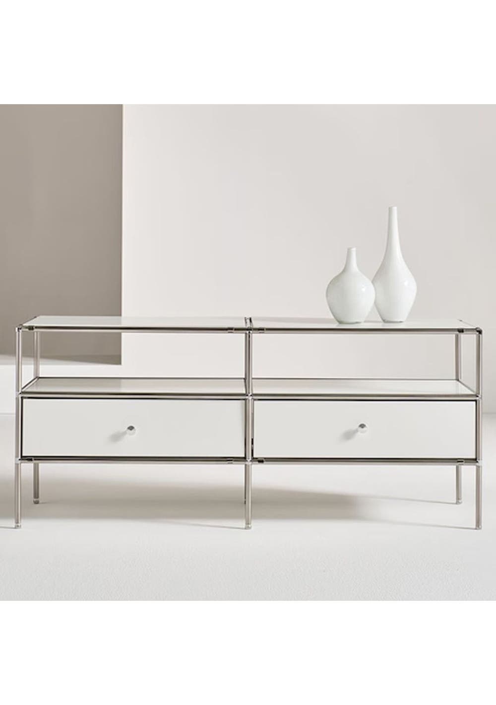 A sleek blend of modern form and industrial strength, this mid-century-inspired entertainment unit is designed to bring bold style and functional elegance into your living space. Featuring a durable stainless steel frame, smooth matte shelves, and thoughtfully designed drawers, it offers both timeless aesthetics and long-lasting practicality. Features ‚ Durable stainless steel frame offers strength and corrosion resistance for long-term use. ‚ Unique frame structure subtly reflects light for a modern and refined look. ‚ Full-extension ball-bearing rail drawers allow smooth and complete access to stored items. ‚ Easy-grip knobs and soft-close mechanism make daily use convenient and quiet. ‚ Height-adjustable feet ensure balance and stability on uneven flooring. ‚ Heat- and moisture-resistant shelves offer durability and easy maintenance. Product Details ‚ Dimension: W 1180 x D 400 x H 520 mm ‚ Materials: LPM, Stainless steel ‚ Assembly Required: No ‚ Available Colours: White, Ivory, Yellow, Teal * Please note that the colour can be different from your monitor * Package includes 1 x Entertainment Unit