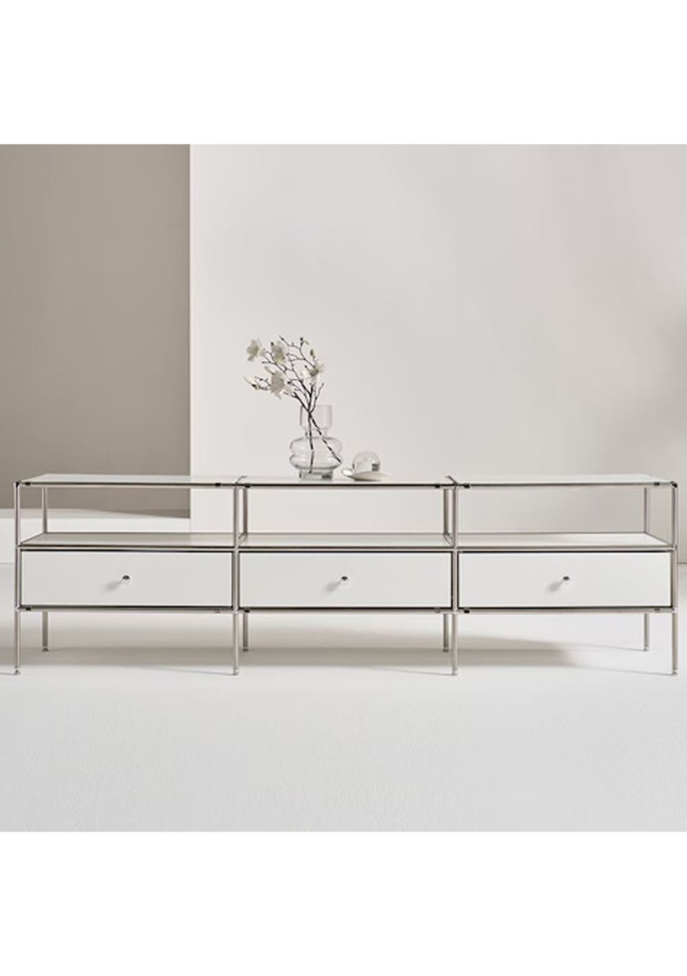 A sleek blend of modern form and industrial strength, this mid-century-inspired entertainment unit is designed to bring bold style and functional elegance into your living space. Featuring a durable stainless steel frame, smooth matte shelves, and thoughtfully designed drawers, it offers both timeless aesthetics and long-lasting practicality. Features ‚ Durable stainless steel frame offers strength and corrosion resistance for long-term use. ‚ Unique frame structure subtly reflects light for a modern and refined look. ‚ Full-extension ball-bearing rail drawers allow smooth and complete access to stored items. ‚ Easy-grip knobs and soft-close mechanism make daily use convenient and quiet. ‚ Height-adjustable feet ensure balance and stability on uneven flooring. ‚ Heat- and moisture-resistant shelves offer durability and easy maintenance. Product Details ‚ Dimension: W 1780 x D 400 x H 520 mm ‚ Materials: LPM, Stainless steel ‚ Assembly Required: No ‚ Available Colours: White, Ivory, Yellow, Teal * Please note that the colour can be different from your monitor * Package includes 1 x Entertainment Unit