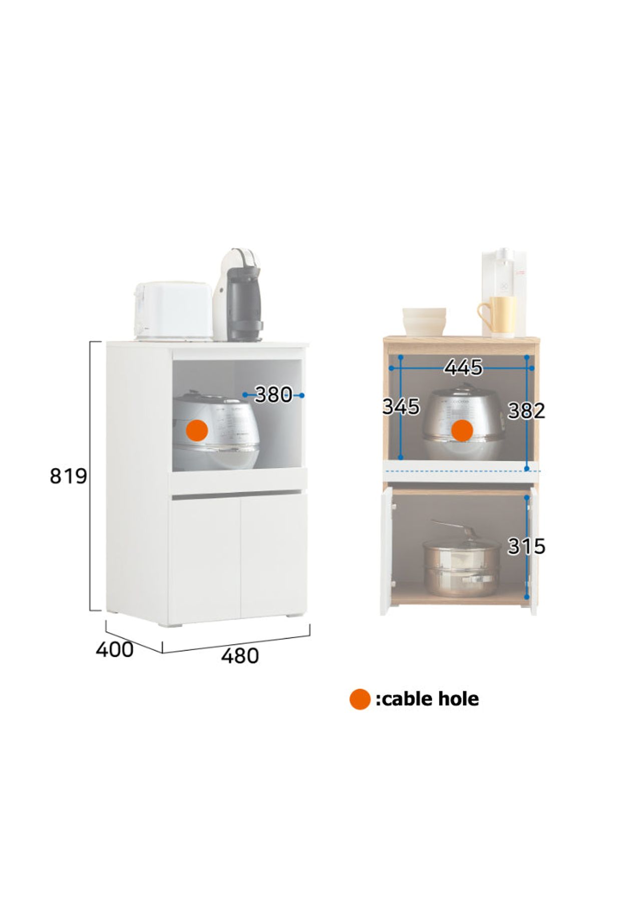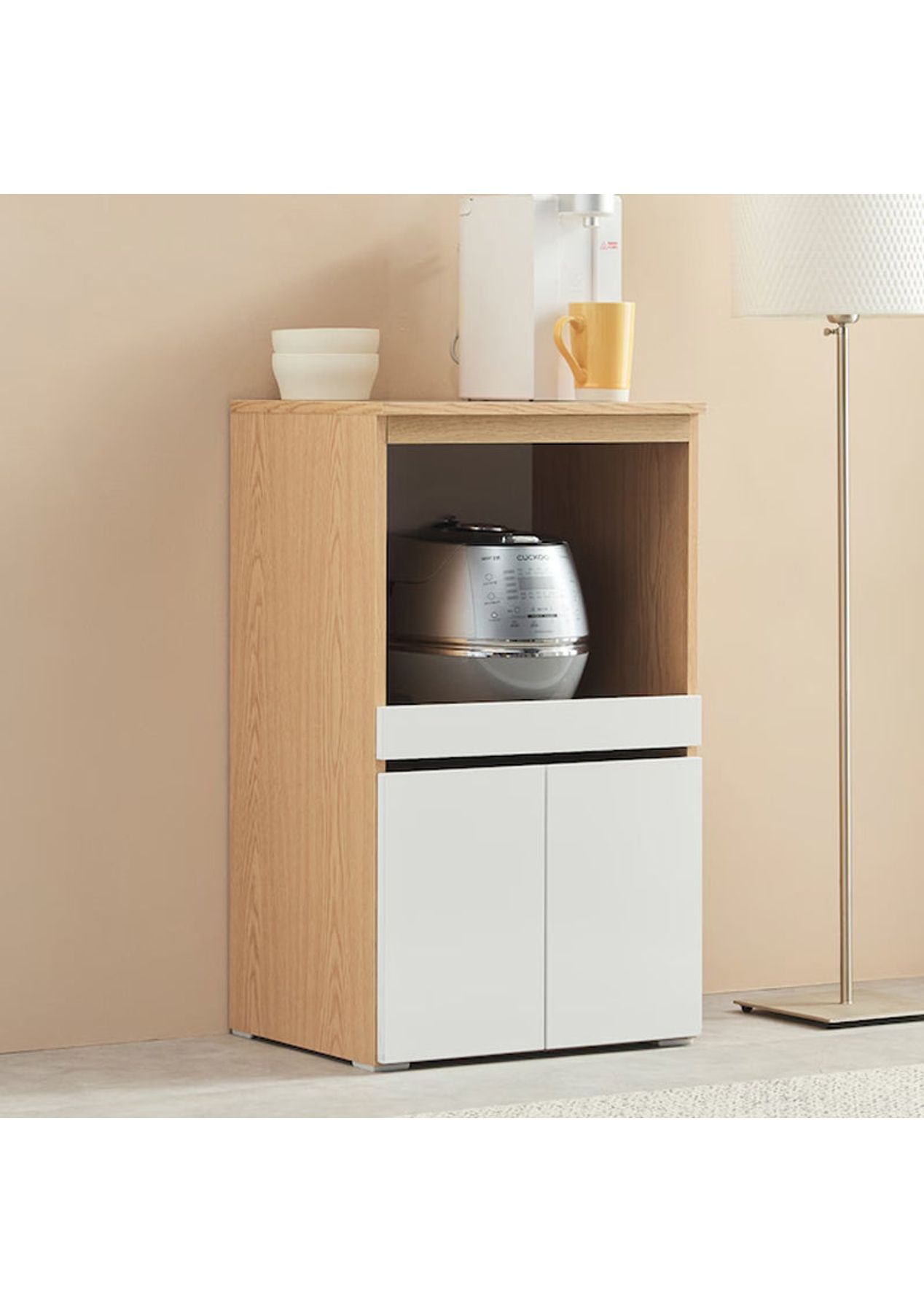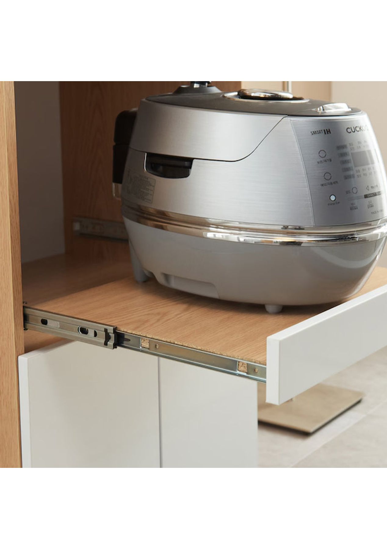 Features: ‚ The sliding shelf includes a cable hole, keeping wires neatly organised and out of sight for a cleaner look. ‚ Equipped with a safety stop bar, the sliding shelf can be fully extended without the risk of it coming off. ‚ Features a sleek, handleless drawer design for a modern, minimalist aesthetic. ‚ Perfect storage solution of appliances like microwaves, rice cookers, coffee machines, toasters, and more. Product details ‚ Dimensions: W 480 X D 400 X H 819 ‚ Materials: LPM, MDF, PB ‚ Assembly Required: No ‚ Colour: White, Oak * Please note that the colour can be different from your monitor * Package includes 1 x Kitchen Cabinet