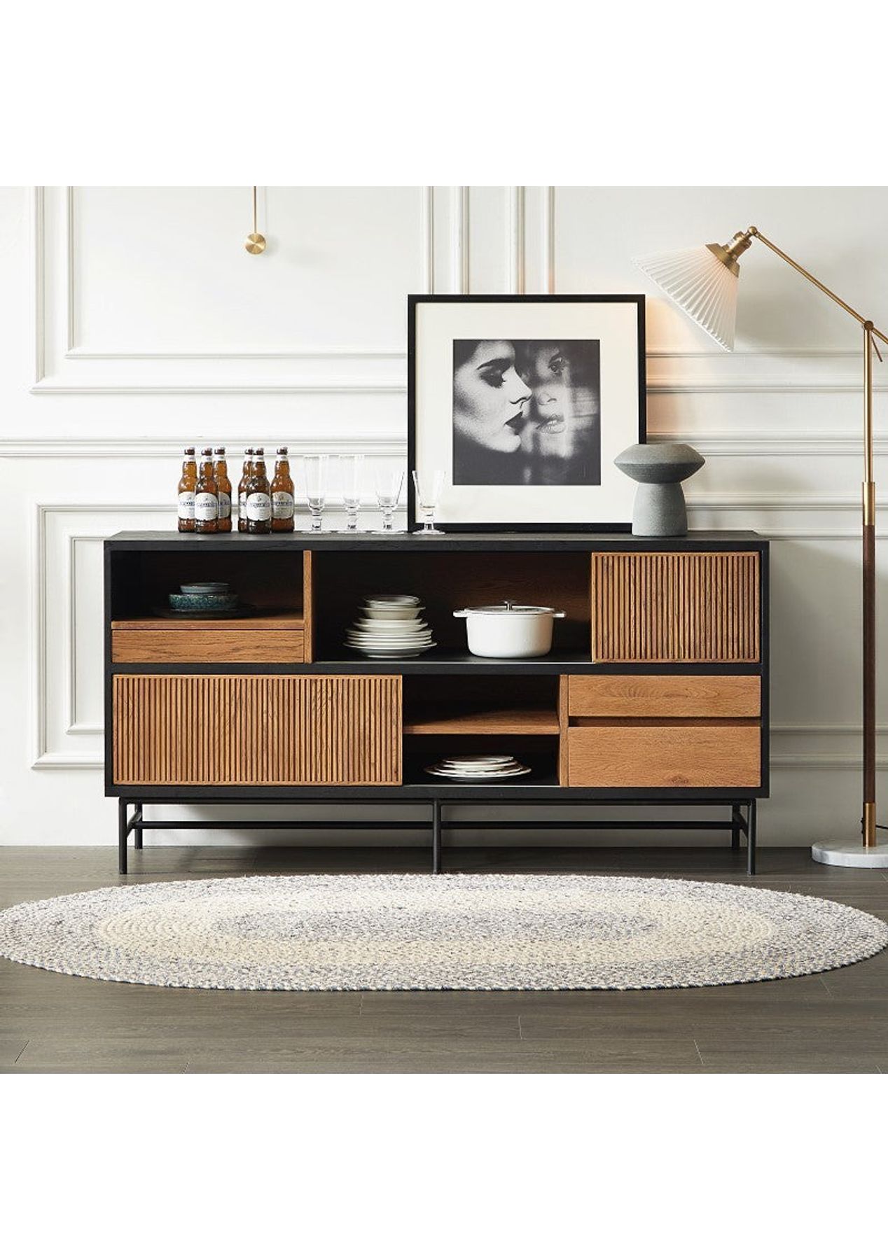 Modern Texture Meets Timeless FunctionalityAdd depth and sophistication to your space with the TAMBO Sideboard, where fluted wood textures meet sleek black framing. Designed for versatile storage and contemporary elegance, it's the perfect blend of form and function. Features‚ Fluted slatted doors and drawers for a rich, modern aesthetic‚ Combination of open shelves and concealed compartments for versatile storage‚ Crafted from solid oak for durability and a natural walnut finish‚ Black accents add contrast and a sleek, minimalist vibe‚ Ideal for dining rooms, living areas, or stylish kitchen storage Product Details‚ Dimension: W 1600 x D 450 x H 800 mm‚ Materials: Oak‚ Assembly required: Yes (simple legs assembly)‚ Colour: Walnut & Black * Please note that the colour can appear different depending on your monitor.* Package includes 1 x TAMBO Sideboard