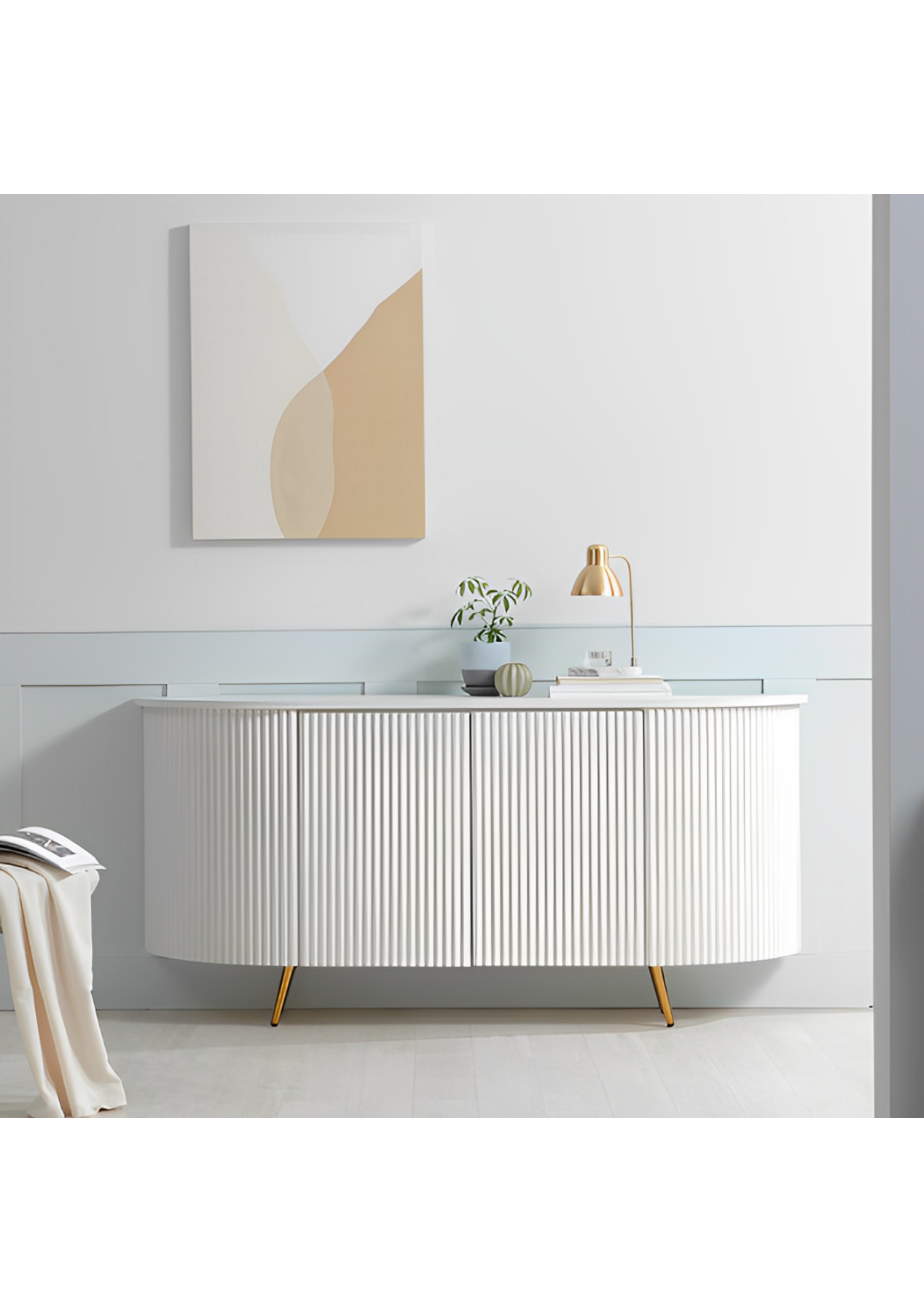Features ‚ Modern & minimal design‚ Sturdy and durable ‚ Push to open doors‚ tambour board style‚ Gold & White colour legs available‚ 18mm Thickness top‚ Rounding edge Product Details ‚ Dimension: W 1590 x D 400 x H 750 mm‚ Materials: LPM(Low-Pressure Melamine), MDF, PB, PVC, Steel‚ Finish: Matt‚ Assembly Required: Yes(Simple legs assembly required)‚ Colour: White * Please note that the colour can be different from your monitor* Package includes 1 x sideboard