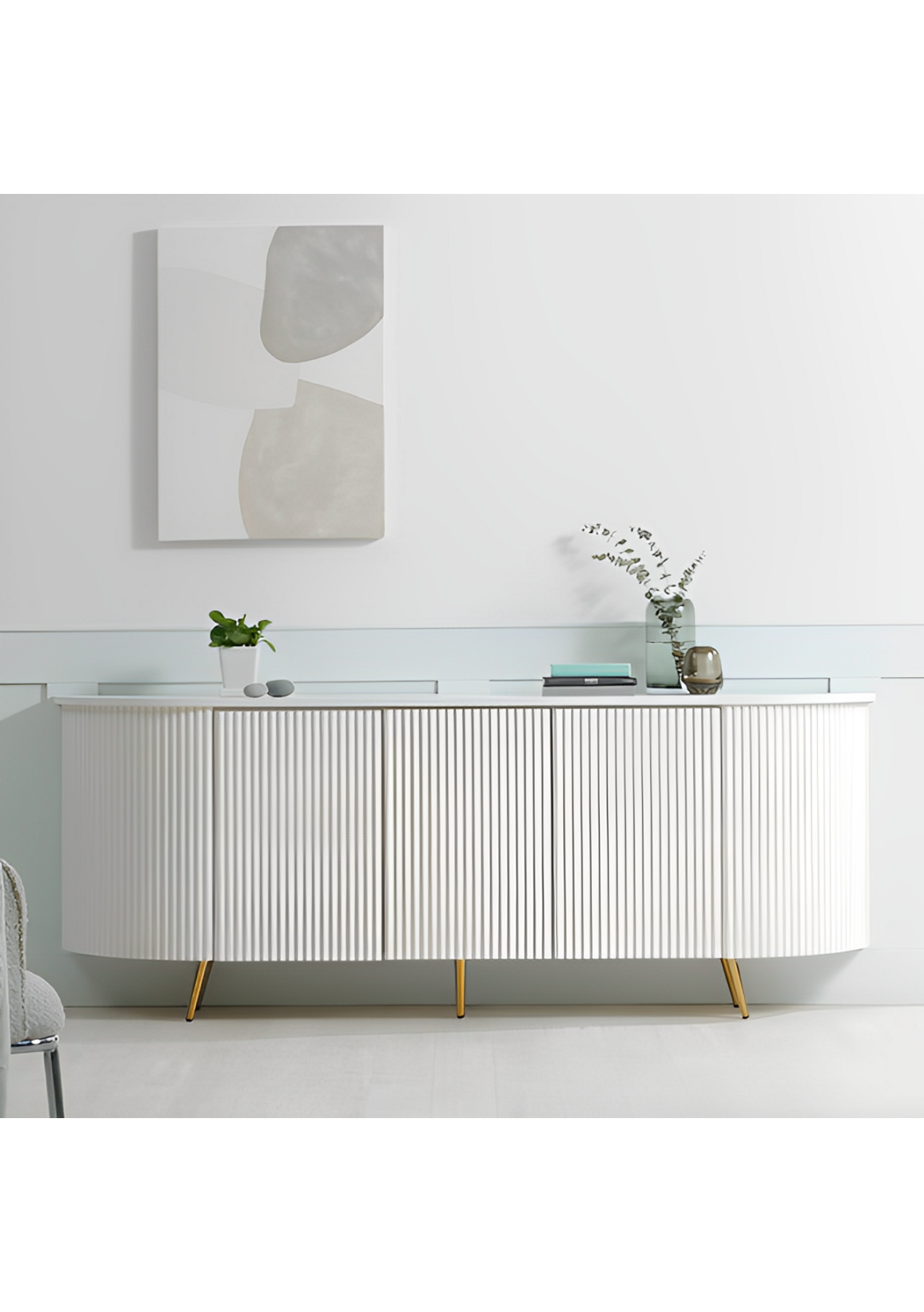 Features ‚ Modern & minimal design‚ Sturdy and durable ‚ Push to open doors‚ tambour board style‚ Gold & White colour legs available‚ 18mm Thickness top‚ Rounding edge Product Details ‚ Dimension: W 2000 x D 400 x H 750 mm‚ Materials: LPM(Low-Pressure Melamine), MDF, PB, PVC, Steel‚ Finish: Matt‚ Assembly Required: Yes(Simple legs assembly required)‚ Colour: White * Please note that the colour can be different from your monitor* Package includes 1 x sideboard