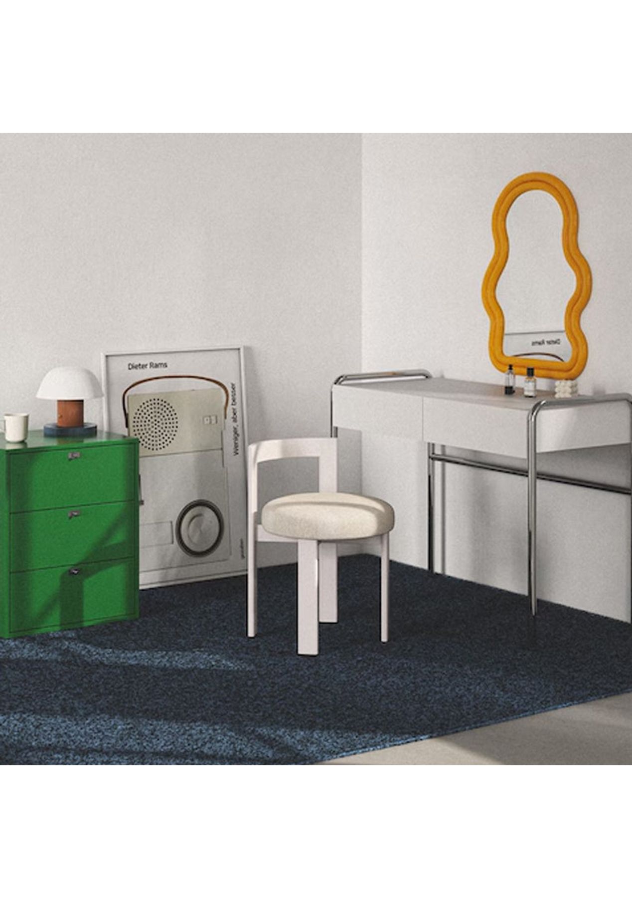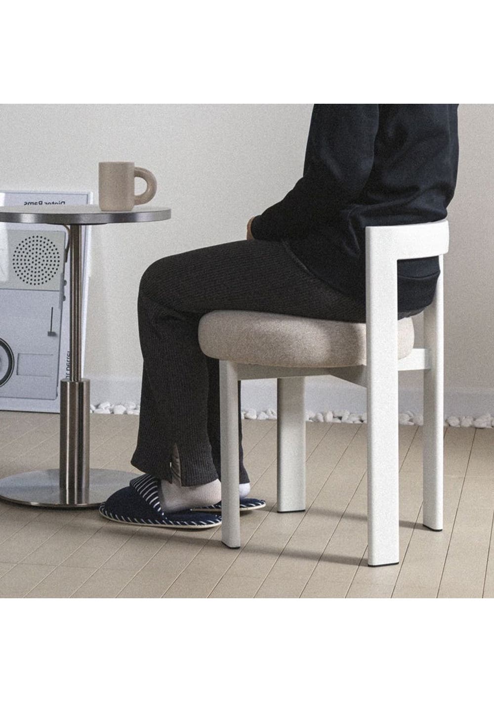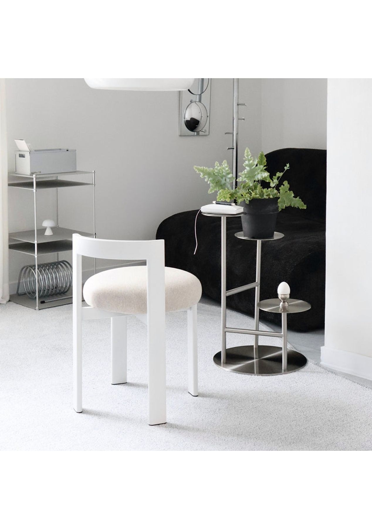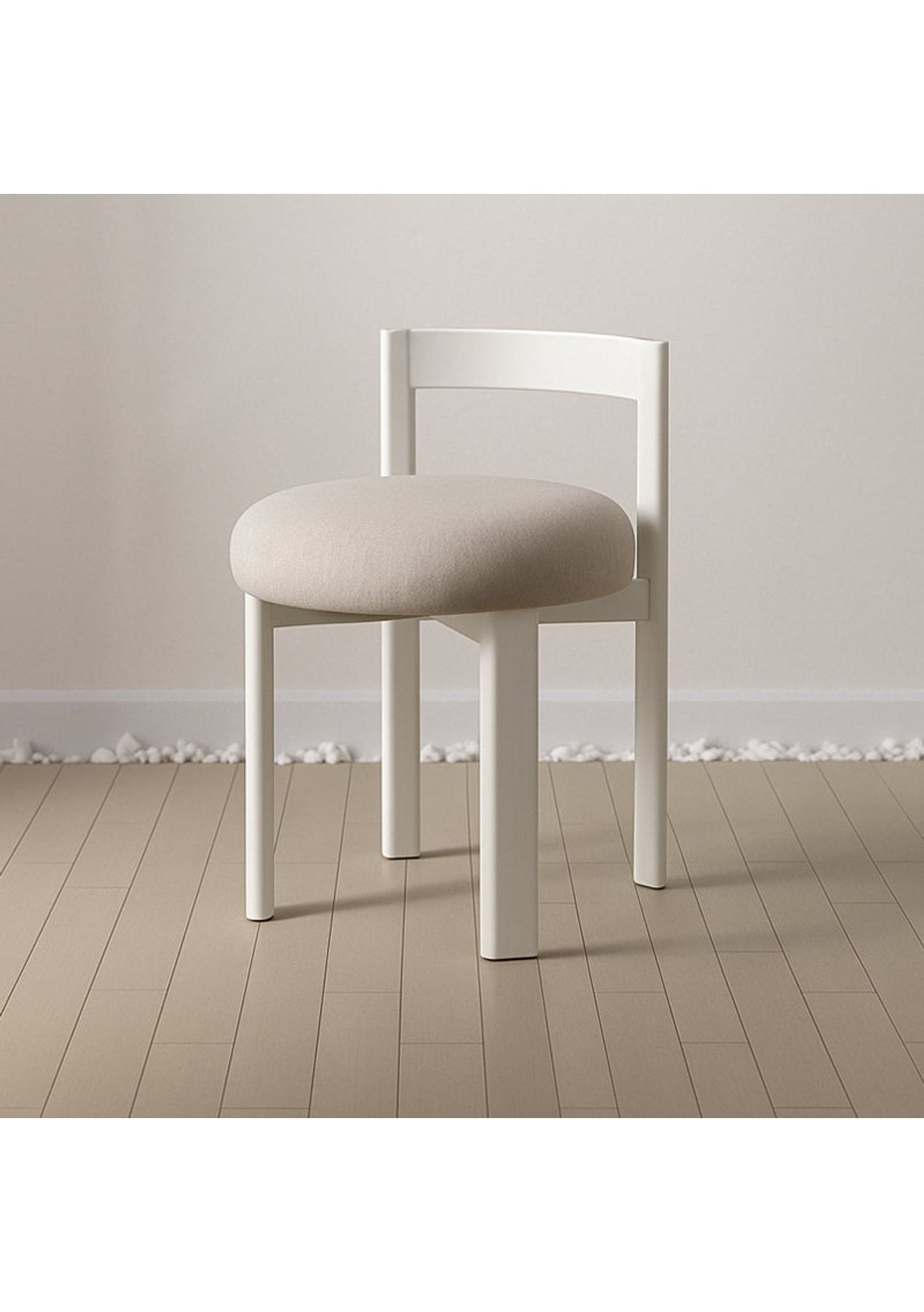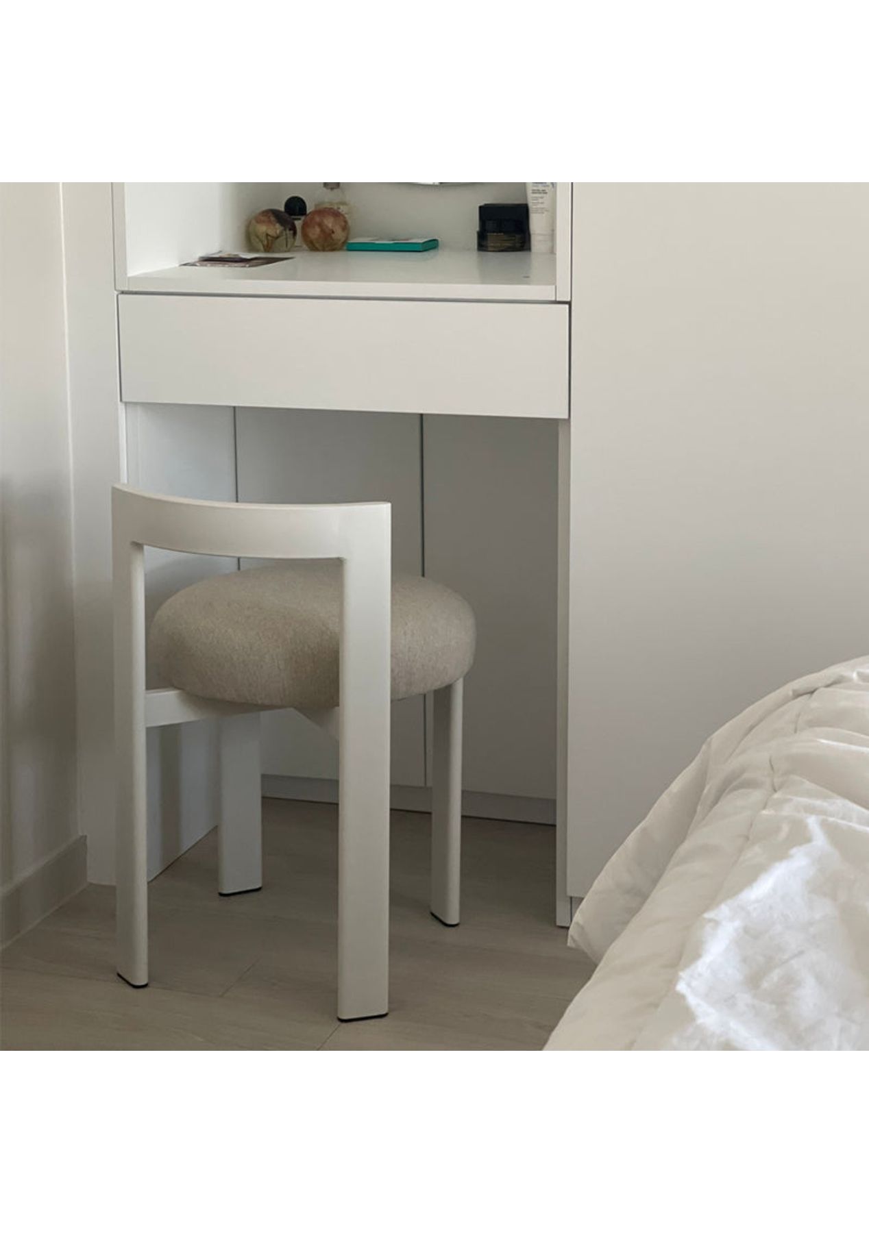Embrace Soft Curves and Open Design That Bring Warmth and Character to Any Space A modern statement chair designed with graceful curves and thoughtful openness‚Äîperfect for adding comfort and style to your everyday spaces. Features ‚ Rounded seat and arched backrest add both softness and a striking. ‚ Open-back design ensures a light, airy presence even in compact spaces. ‚ Plush cushioned seat offers exceptional comfort for extended use. ‚ Curved backrest gently supports the lower back for ergonomic seating. ‚ Versatile design fits perfectly as a vanity chair, dining seat, or accent piece in commercial spaces. ‚ A perfect balance of function and form that enhances both minimalist and cozy interiors. Product details ‚ Dimensions: W 400 x D 470 x H 600 mm ‚ Materials: Steel, PU Fabric ‚ Assembly required: No ‚ Available colour: White, Beige, Black * Please note that the colour can be different from your monitor * Package includes 1 x Stool(White)