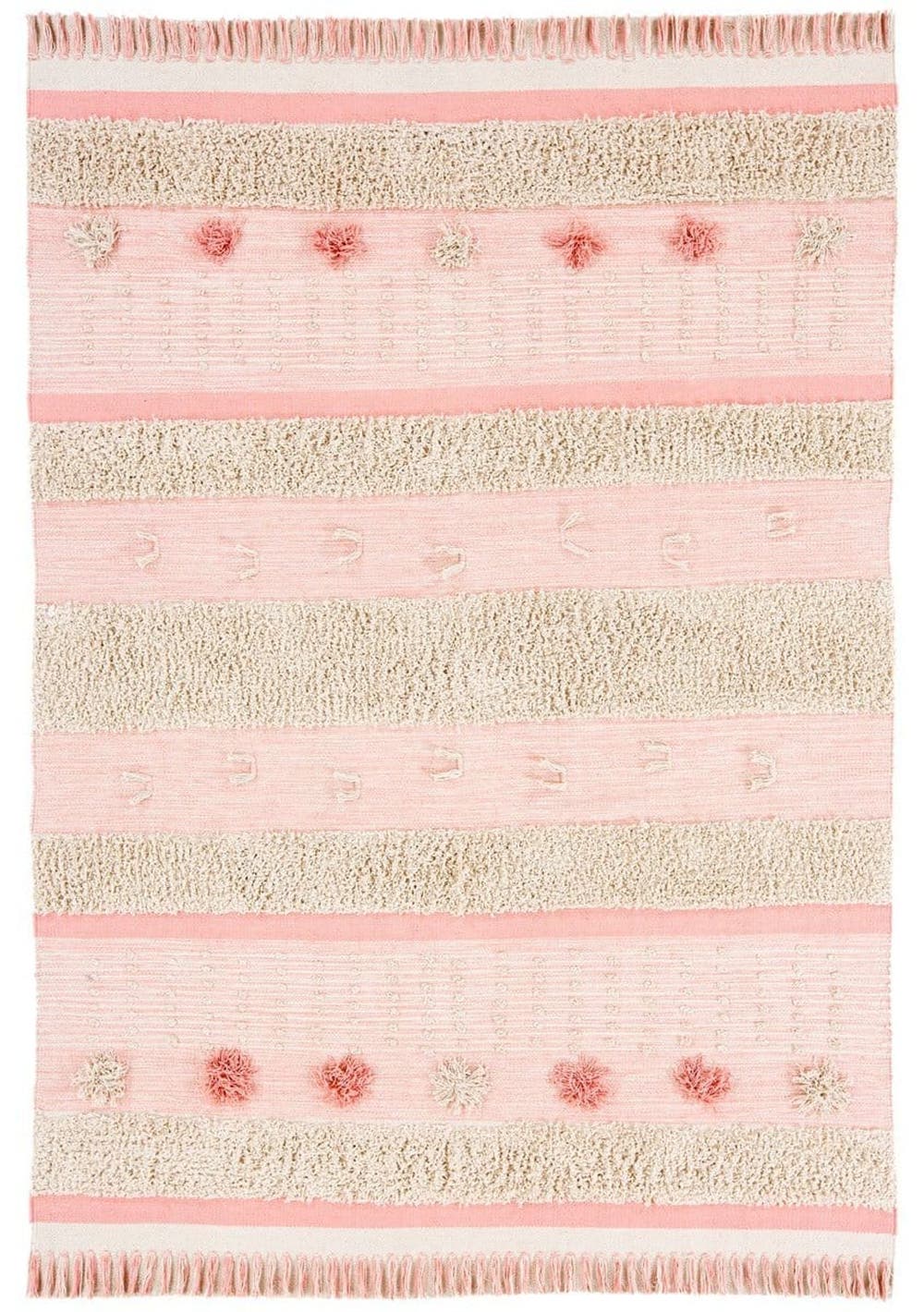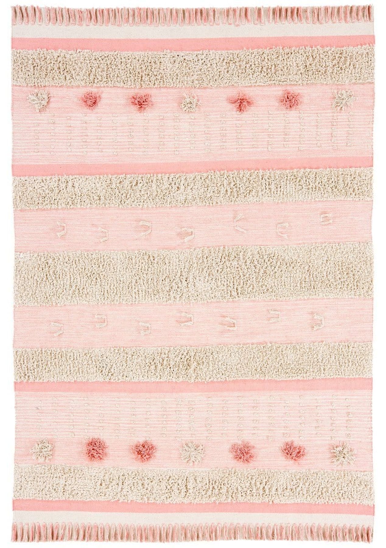 Part of the exclusive Miss Amara Wonderland Collection, Valentina is a gorgeous flatweave rug in a sweet pink and ivory colour combination. With whimsical tassel fringing, pom-pom detailing and gorgeous soft pink colourway, Valentina is a perfect addition to the kid's rooms or anywhere in your home where you want to add a pop of playful design. Hand-woven from recycled cotton, this eco-friendly design has been crafted in a flatweave style and feels silky soft and light underfoot. As this is a low profile, flatweave style, we recommend using with a non-slip underlay to prevent any unwanted buckling and movement.Please note that dimensions shown on site are exclusive of tassels.This product is lovingly handmade by skilled artisans and as such may encounter variations in pattern and colour which may vary from the images shown, this is entirely normal and part of the inherent nature of the production techniques. The size may also vary up to 5% in length and width due to natural variations in materials.