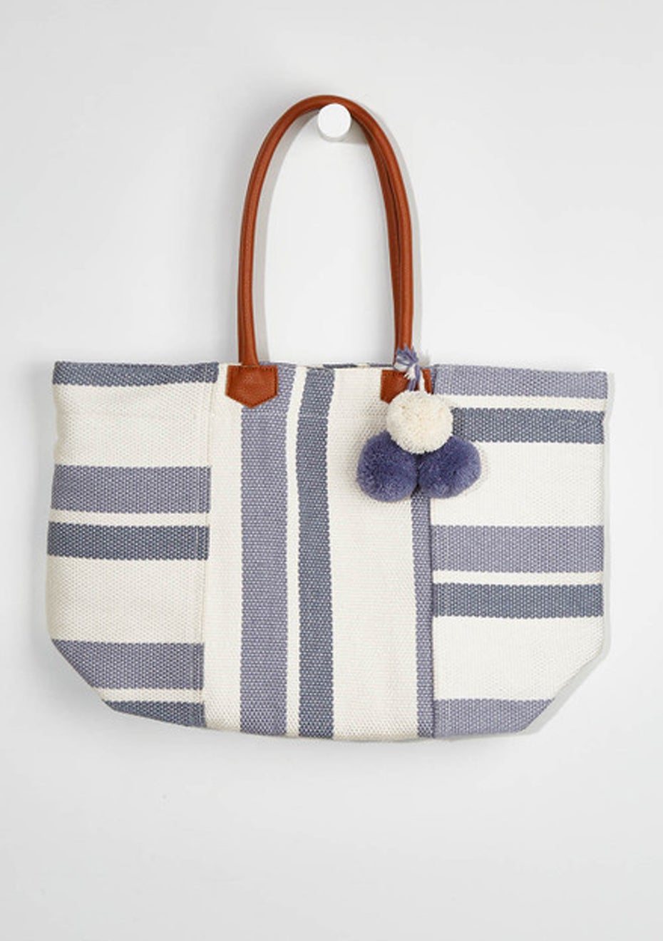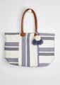 One size Tote style Single magnetic button snap closure 1 outside pocket 1 inside pocket Pom-pom detail on handle Woven canvas fabric feel Faux leather handle 20cm height Lined 100% polyester Polyurethane handles Size approx. 30cm H x 45cm W x 12cm D Designed in Australia Made in China