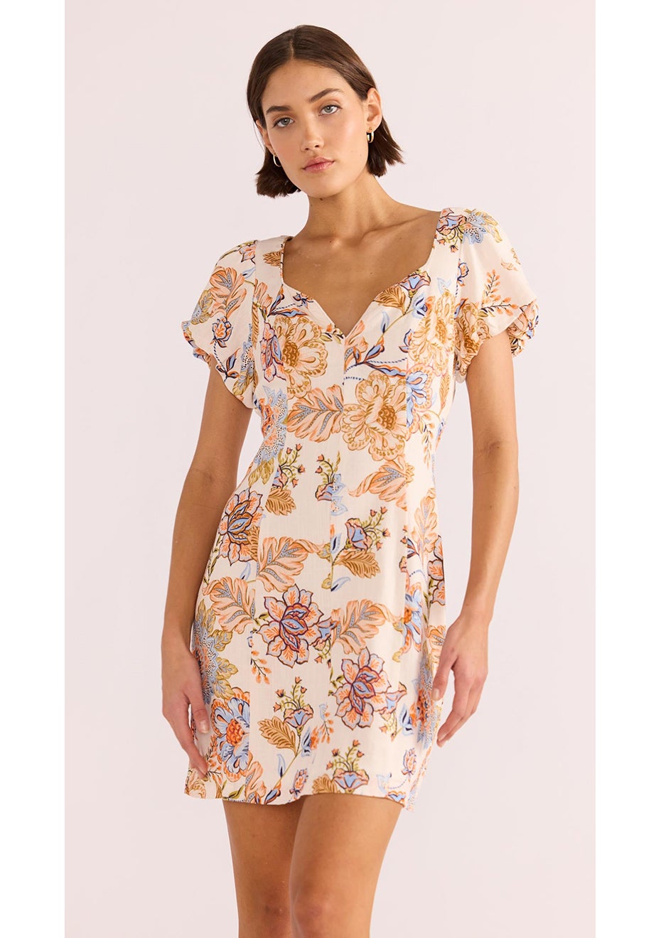 The Marceline Panel Mini Dress encapsulates divine femininity. Featuring a bold floral pattern on a lightweight fabrication. This print is exclusive to MINKPINK. Style with your favourite neutral heel to complete the look. - Square V neckline - Short puffed sleeves - Fitted bodice - Invisible center back zipper - Designed in Sydney, Australia 80% Viscose 20% Linen, Lining: 100% Viscose - Wash separately - Do not bleach/soak/wring or tumble dry - Dry flat in the shade - Cool iron if needed on the reverse side