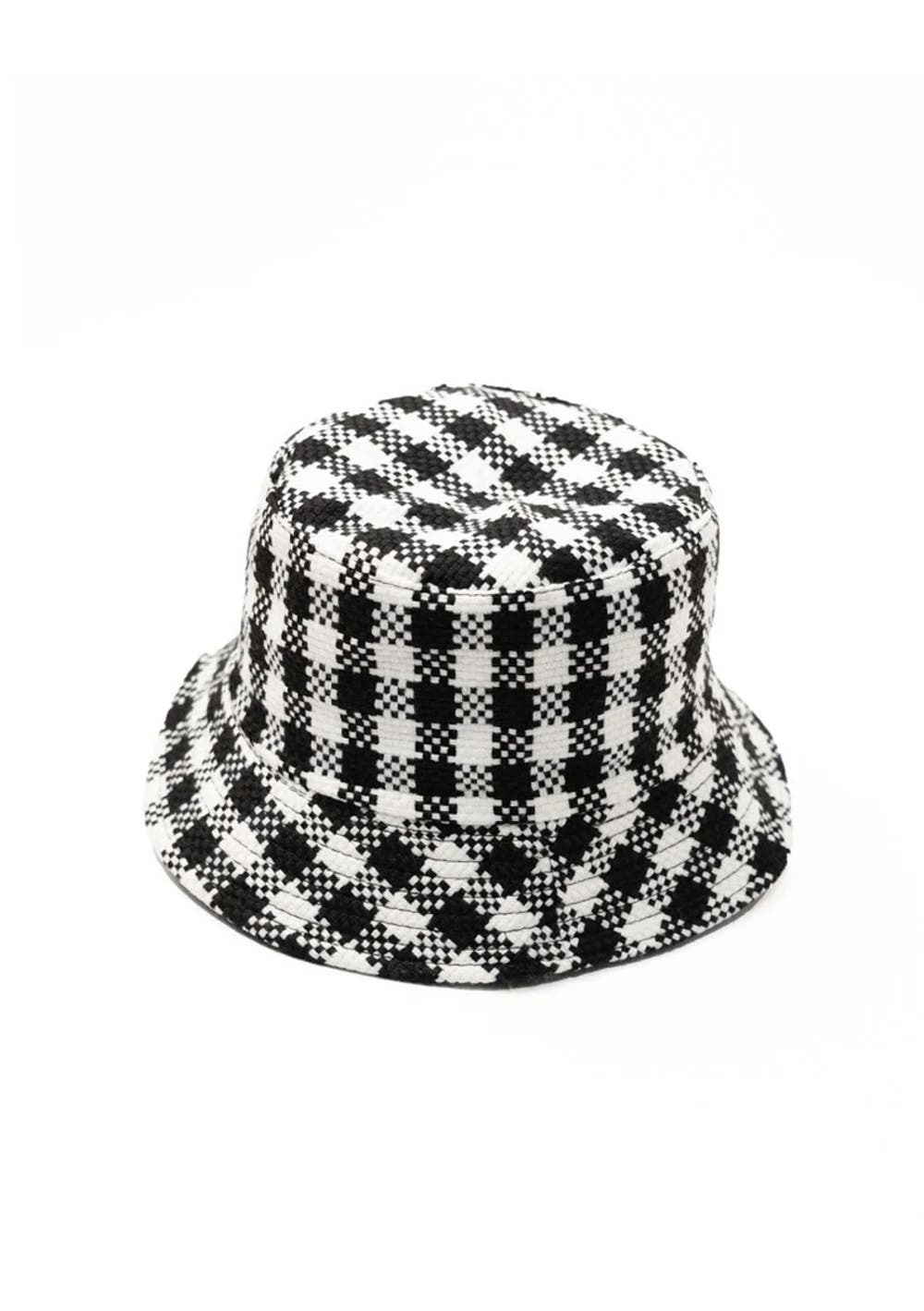 White and Black check bucket hat with on trend plaid print 100% Polyester Made in China