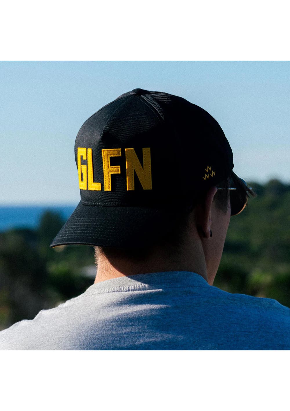 Let's go GLFN! Arguably our most comfortable hat yet. Flexfit 110 stretch tech head band that seriously feels like you're not wearing anything at all. Black 5 Panel Nylon Cotton Spandex Mix Yellow Felt Appliqué GLFN Perforated Back for Maximum Breathability Plastic Snap Curve Brim Signature Birds of Condor Internal Taping Structured Crown OSFA (Will Suit Larger Heads)