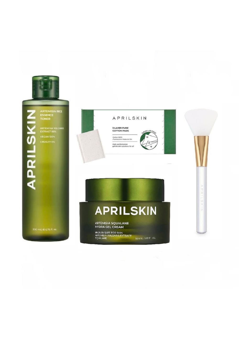 Ever wonder why oily skin stays oily? Your skin could be dehydrated! Dehydrated oily skin produces more oil, so it's important to hydrate from deep within. Aprilskin's Hydration Duo not only hydrates deeply to prevent excess sebum production, but it also soothes and protects skin that breaks out from environmental stressors such as excessive heat, dust, allergens, and more. After toning with the Artemisia Toner, use the Artemisia Cream with the Jade Roller to give your skin a cooling massage for soft, smooth, and calm skin!Package includes:-Vegan Artemisia Calm Energy SetArtemisia Rice Essence Toner (200ml)ARTEMISIA SQUALANE HYDRA GEL CREAM (50ml)3 Layer Pure Cotton PadsReal Calendula Jelly Brush
