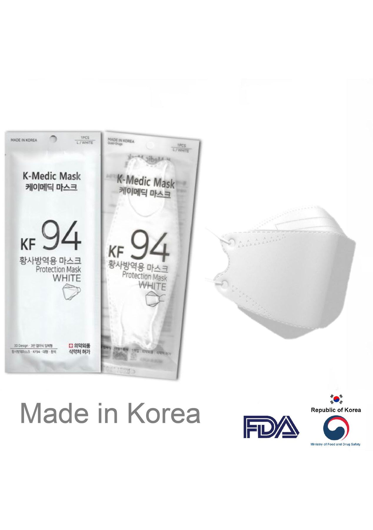 K-Medic KF94 Face Mask is a type of face mask that is designed to provide a high level of protection against airborne particles and viruses. KF94 masks are a type of respirator that is widely used in South Korea and are known for their effectiveness in filtering out harmful substances. The K-Medic KF94 Face Mask is made with multiple layers of high-quality materials that work together to filter out airborne particles. These layers typically include a non-woven fabric outer layer, a melt-blown fabric middle layer, and a soft inner layer for comfort. The mask is designed to fit securely over the nose and mouth, providing a tight seal to prevent the entry of particles. KF94 masks are known for their high filtration efficiency, capable of filtering out at least 94% 94% 0.4„éõ of airborne particles, including viruses and bacteria. They are particularly effective in filtering out fine particles and aerosols, making them suitable for various environments, including healthcare settings, public spaces, and personal use.Its design is 3D three-dimensional with veneer tailoring on the face and a comfortable belt with no irritation to the ears. Contents:White - 1 mask per pack (individually packaged) easy to CarryMADE IN KOREA.FDA Approved.