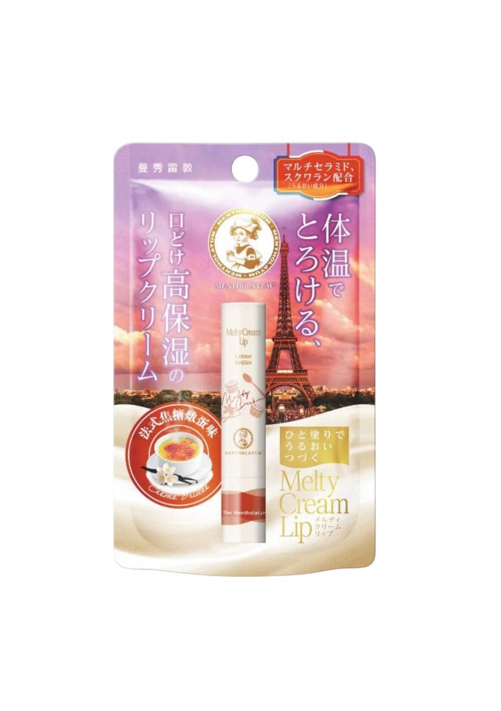 Mentholatum Melty Cream Lip Balm SPF 25 PA+++ Creme Brulee features a Creme Brulee flavor, adding a sweet scent and taste to the lip balm. The lip balm is designed to provide intense moisture and protection to the lips while offering sun protection with SPF 25 and PA+++. The formula includes moisturizing ingredients like shea butter, jojoba oil, and squalane to keep the lips hydrated and prevent dryness. The addition of the Creme Brulee flavor gives the lip balm a delightful and indulgent experience, adding a touch of sweetness to your lip care routine. To use the Rohto Mentholatum Melty Cream Lip Balm, simply apply a thin layer onto the lips as needed throughout the day.