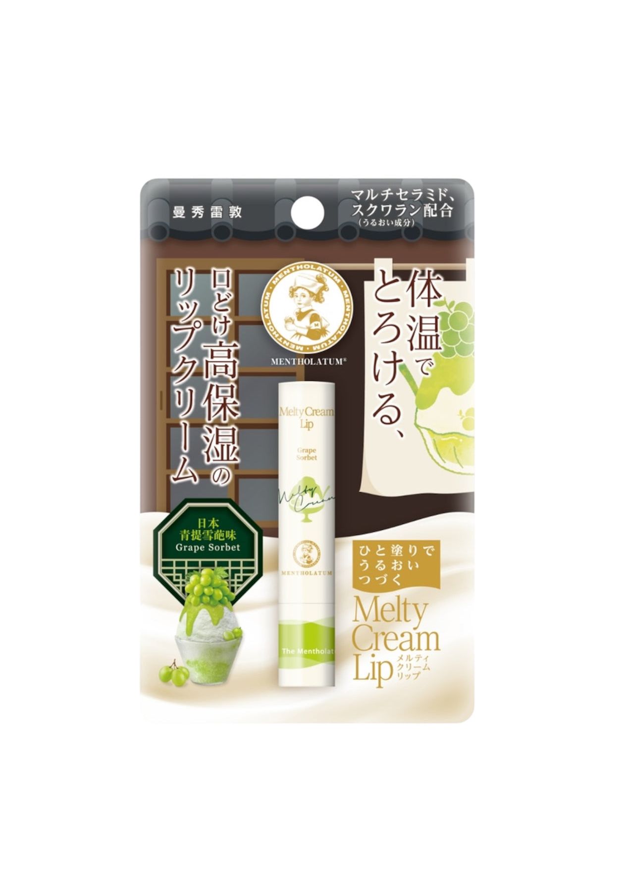 Mentholatum Melty Cream Lip Balm SPF 25 PA+++ Grape Sorbet features a Grape Sorbet flavor, adding a sweet scent and taste to the lip balm. The lip balm is designed to provide intense moisture and protection to the lips while offering sun protection with SPF 25 and PA+++. The formula includes moisturizing ingredients like shea butter, jojoba oil, and squalane to keep the lips hydrated and prevent dryness. The addition of the Grape Sorbet flavor gives the lip balm a delightful and indulgent experience, adding a touch of sweetness to your lip care routine. To use the Rohto Mentholatum Melty Cream Lip Balm, simply apply a thin layer onto the lips as needed throughout the day.